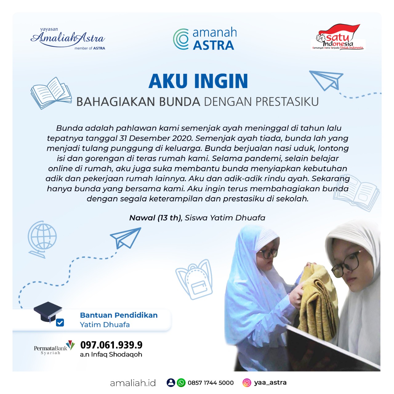 Nawal, salah satu siswa yang kini menjadi yatim sepeninggal ayahnya pada pandemi awal lalu. Kini hanya Bundanya yang mengurus keluarga mereka. Menyambung hidup dengan membuka warung kecil-kecilan di teras rumah. Walau kondisi sedang seperti ini, Nawal dan adiknya tetap semangat bersekolah. Ia ingin terus membahagiakan sang Bunda dengan prestasinya.