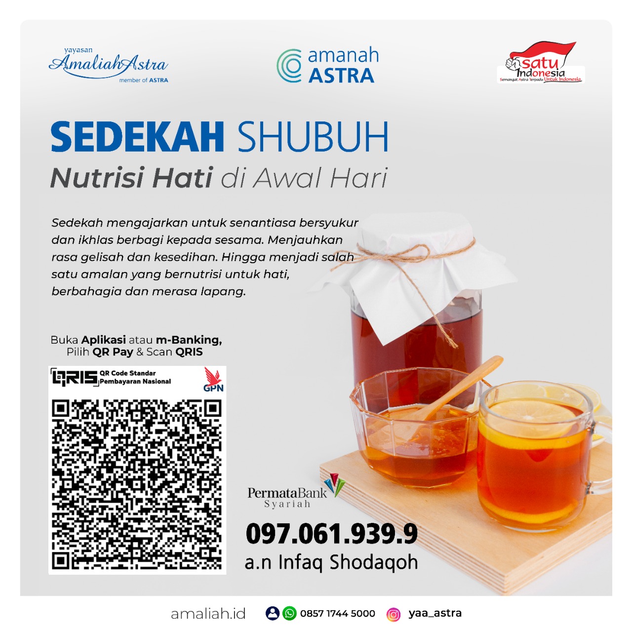 Salah satu asupan yang bernutrisi untuk hati adalah bersedekah. Dengan berbagi, hati semakin bersyukur dan ikhlas memberi. Sarapan untuk hati ini sangat penting bagi kita menjalani aktivitas sepanjang hari.