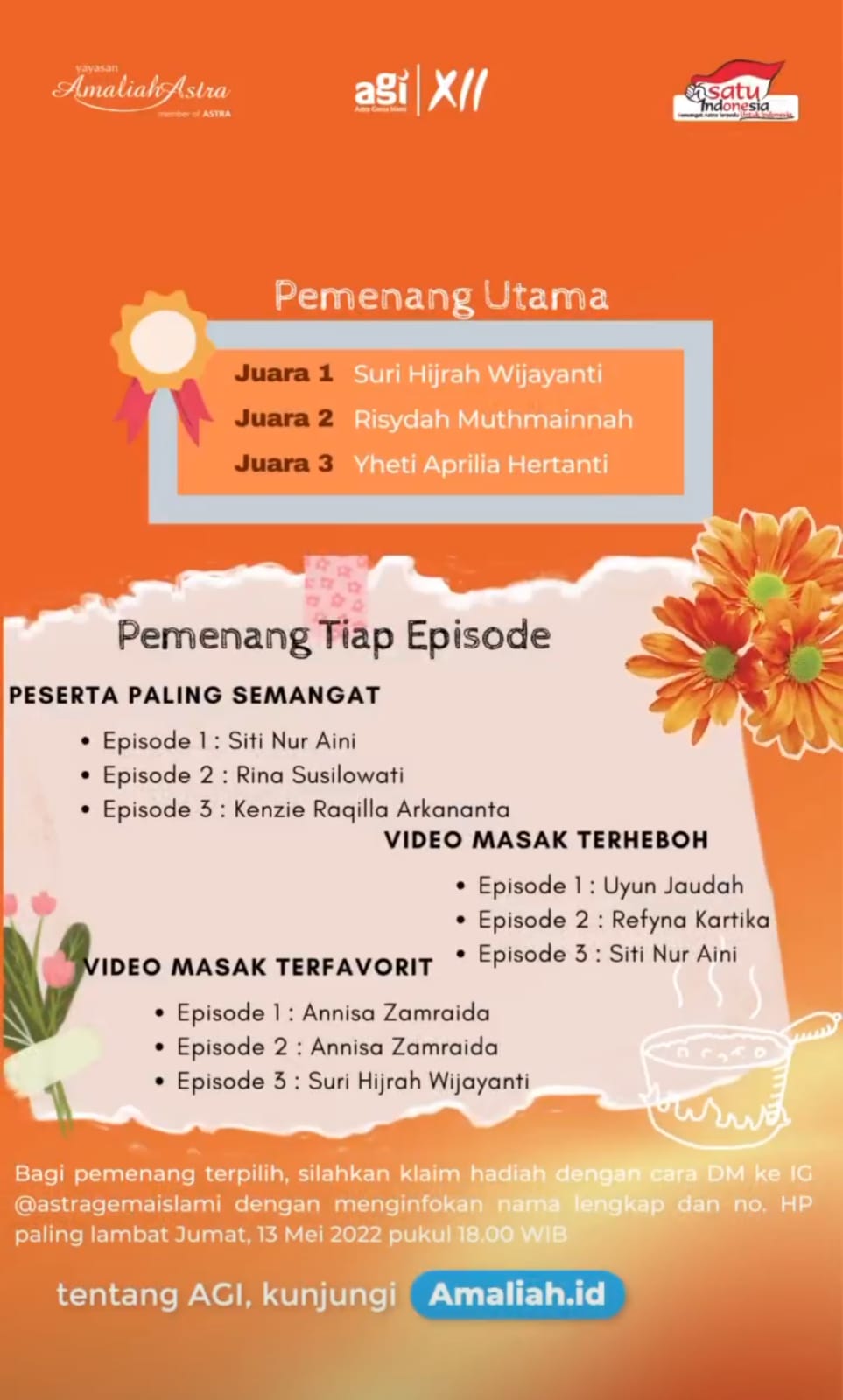 Assalaamu'alaikum Pegiat Go Green AGI XII, Semangat hari Senin! Bagaimana kabarnya? Semoga semua dalam keadaan baik dan sehat, ya.Terima kasih banyak ya atas antusiasme teman-teman dalam mengikuti rangkaian acara Go Green kami ☺️ Berikut ini adalah nama-nama juara utama 1, 2, dan 3 Lomba Video Go Green Campaign AGI 2022: