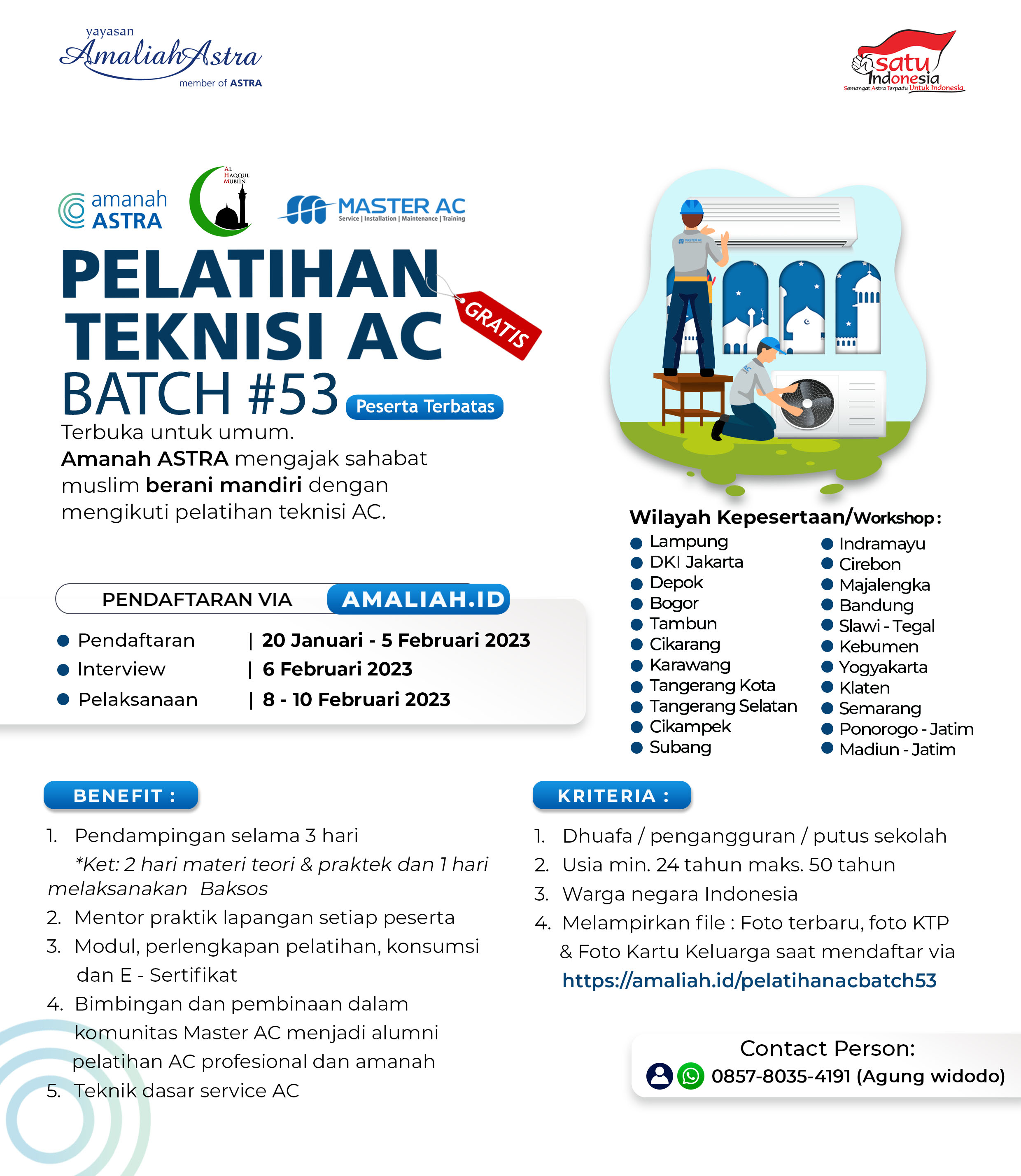 Pendaftaran Pelatihan Teknisi AC Batch#53 Bangkit MandiriNyok buruan daftar ambil peluang buat jadi pengusaha sukses & mandiri dibidang jasa pendingin, Yuk kita berbagi info kebaikan untuk orang terdekat kita. Siapa tau ini bisa jadi jalan sukses bagi saudara kita.