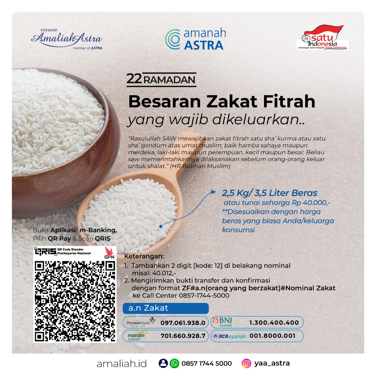 Wajib dikeluarkan 2,5kg beras per jiwa. Sudah di hari-hari akhir Ramadan. Semakin lengkap menjalankan ibadah di Ramadan ini dengan menunaikan kewajiban zakat. Ada berkah dan manfaat dari amal yang Anda keluarkan.