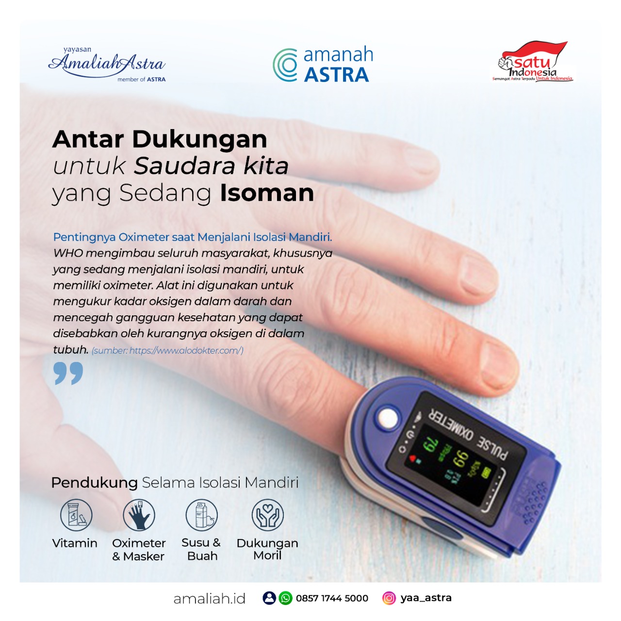 Dukungan orang terdekat menjadi booster tersendiri untuk mereka yang sedang isolasi mandiri. Kebutuhan alat medis dan asupan vitamin juga tentunya mendukung kepulihan mereka saat di rumah. Saat ini, _pulse oximeter_ dibutuhkan untuk pasien Covid-19. Agar setiap harinya mereka dapat mendeteksi kadar saturasi oksigen di dalam darah. Disaat seperti ini, mari saling support mereka yang sedang berjuang negatif untuk bisa sehat kembali.