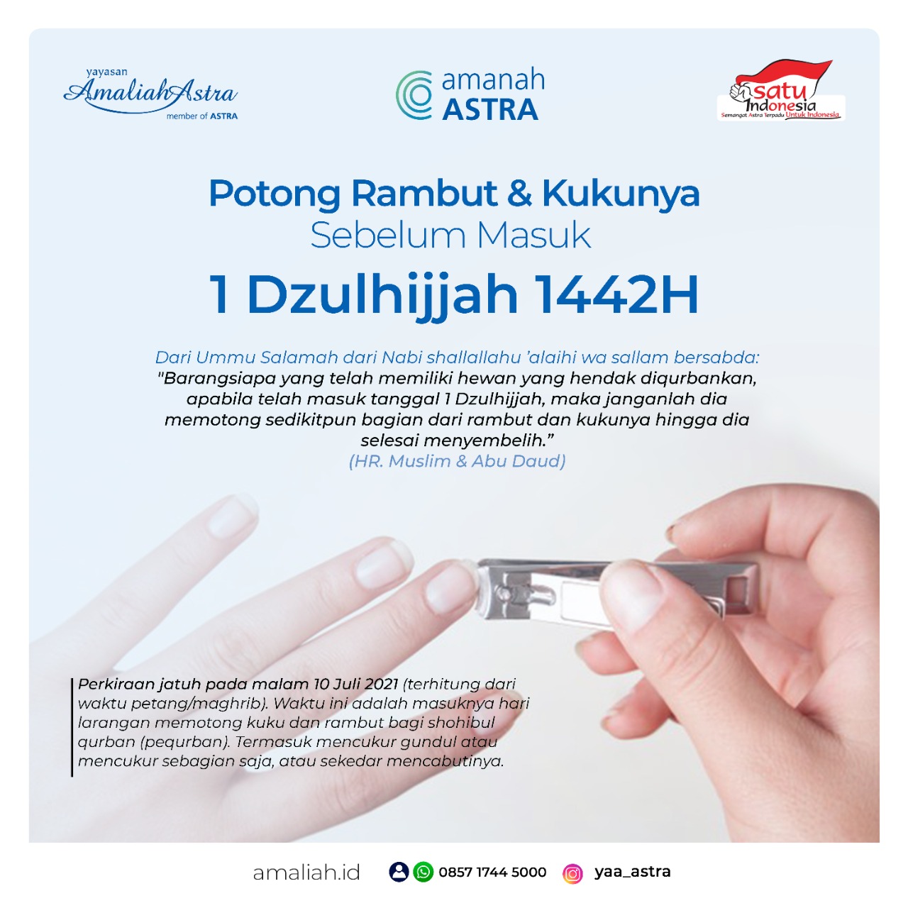 Yaitu larangan memotong rambut dan kukunya setelah masuk 1 Dzulhijjah. Jadi pastikan tidak melewatkan hal ini. Anda dapat memotong rambut/kuku sebelum tanggal 11 Juli 2021 (perkiraan kalender masehi) atau sesudah waktu penyembelihan hewan qurban Anda.