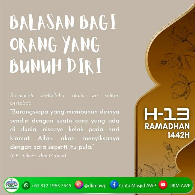 4 tahun yang lalu PublikBunuh diri dilarang dalam Islam. Semoga kita terhindar dari perbuatan terlarang tersebut. Aamiin.