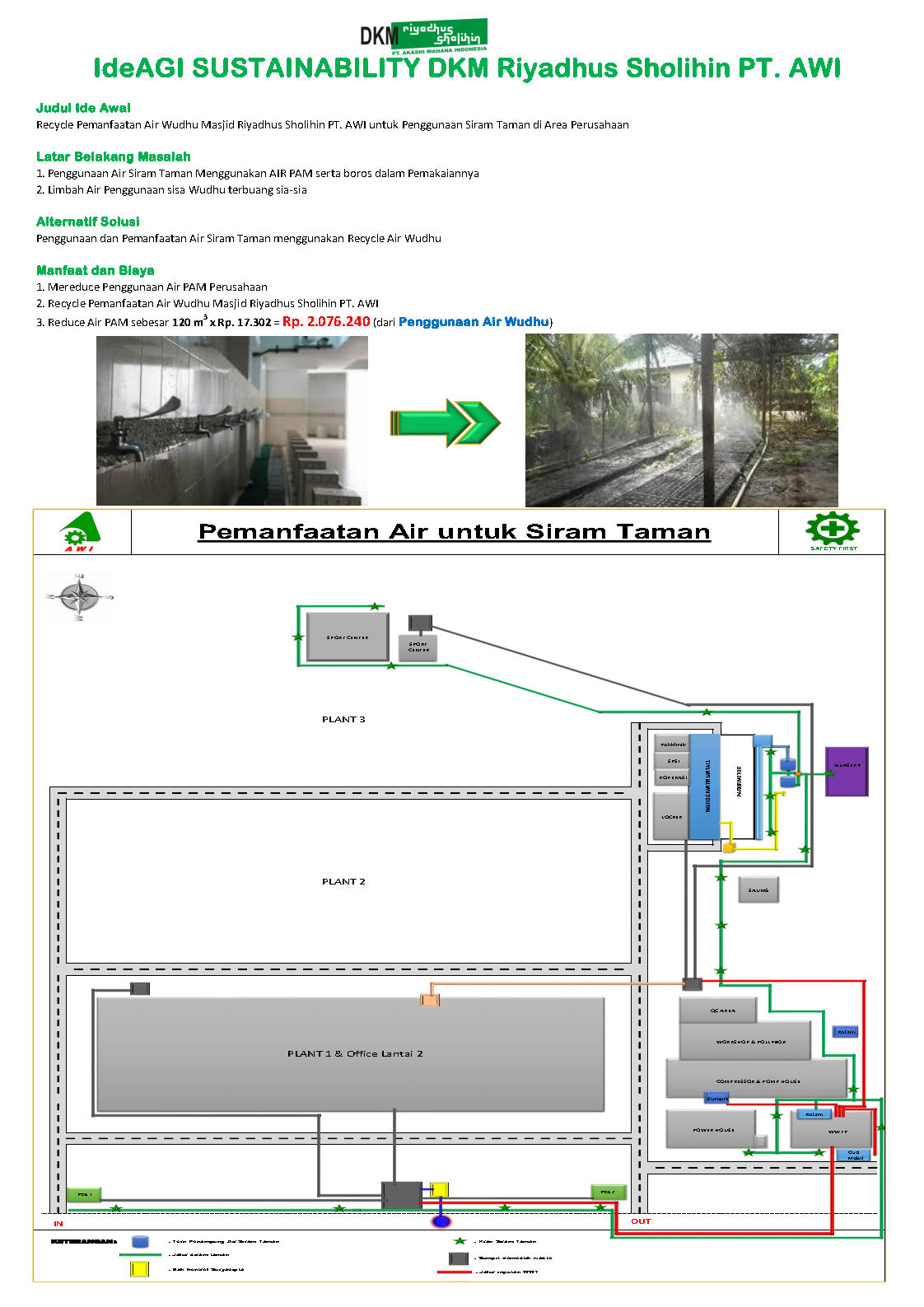 1. Mereduce Penggunaan Air PAM Perusahaan2. Recycle Pemanfaatan Air Wudhu Masjid Riyadhus Sholihin PT. AWI