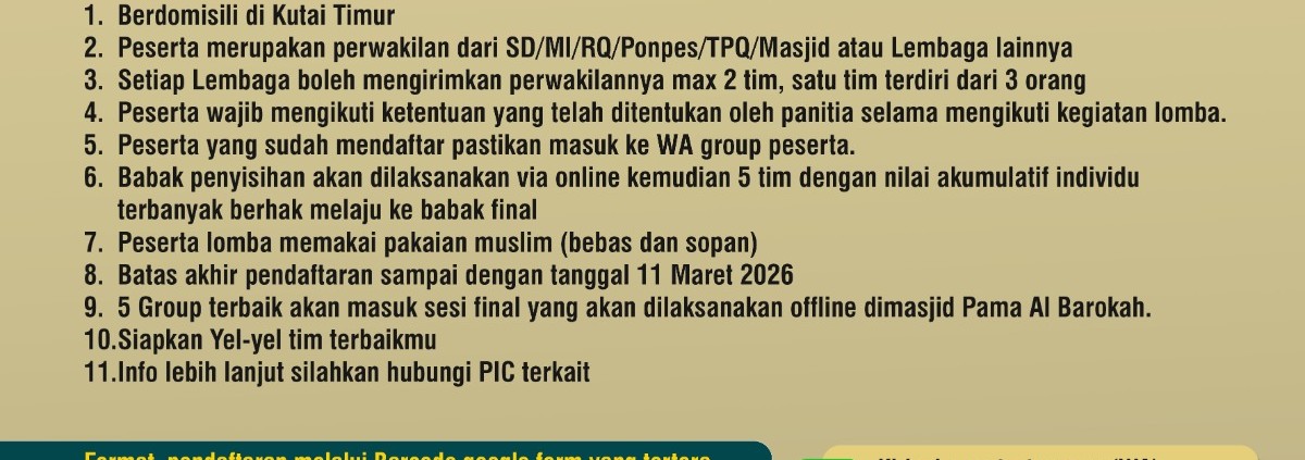 Peserta diwajibkan mengenakan pakaian muslim yang sopan dan mengikuti seluruh ketentuan yang telah ditetapkan panitia. Batas akhir pendaftaran ditetapkan hingga 11 Maret 2026. Oleh karena itu, calon peserta diharapkan segera mendaftarkan diri melalui barcode Google Form yang tersedia pada poster atau mengirimkan format data (Nama, Alamat, Umur, Lomba & Kategori) kepada PIC yang telah ditentukan.