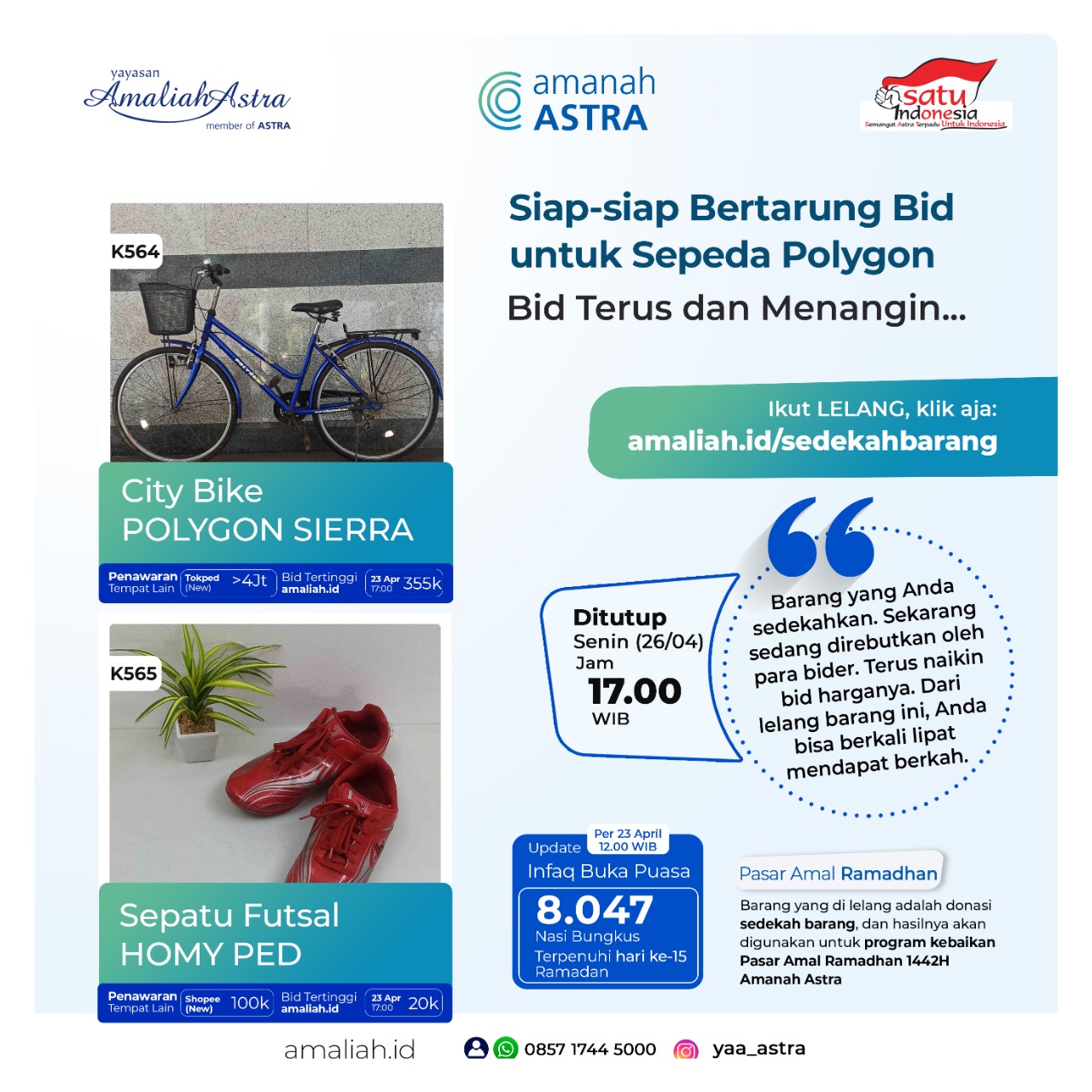 Mantap Sob! ada sepeda terpajang di etalase lelang kali. Buruan cek di https://amaliah.id/sedekahbarang
