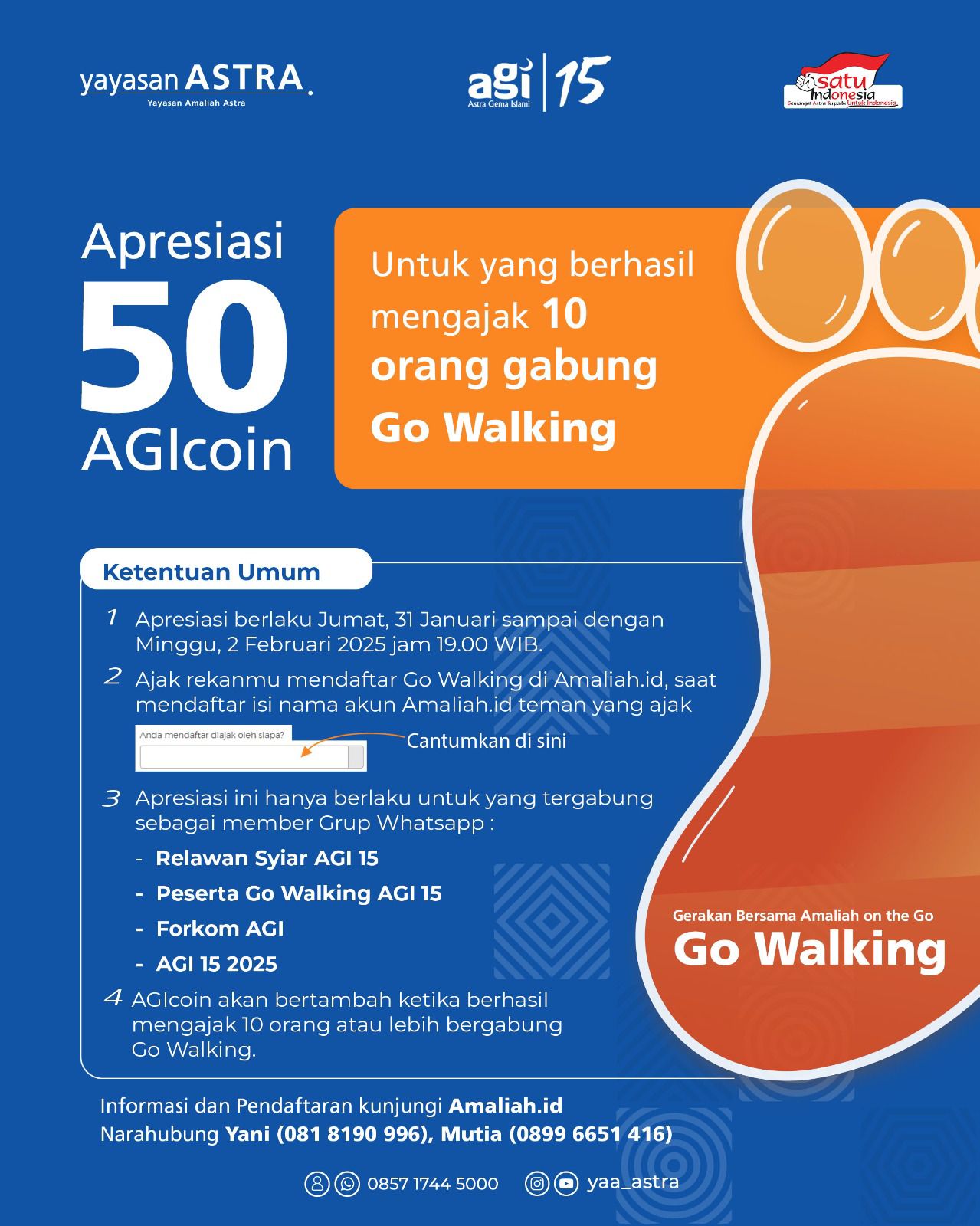 Raih kesempatan mendapat 50 AGIcoin setiap kalian berhasil mengajak 10 teman atau lebih gabung bersama di Amaliah On The Go - Go Walking AGI 15. Caranya gampang banget, cukup daftarkan mereka di Amaliah.id dan pastikan mereka mencantumkan nama akunmu.