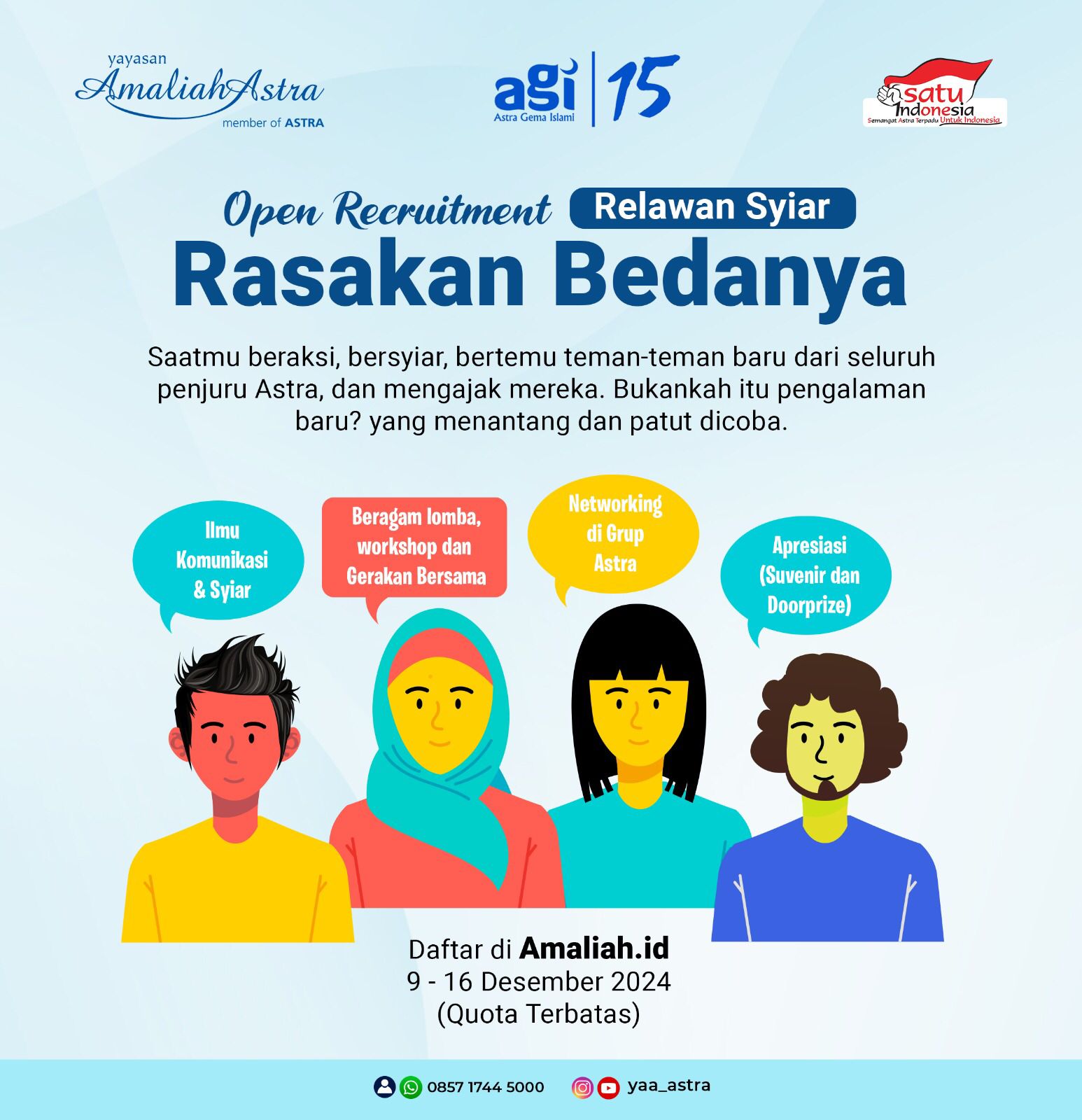 Untuk Disebarluaskan di Grup AstraJadikan dirimu bagian dari perjalanan luar biasa di Syiar AGI-15! Dengan bergabung sebagai relawan syiar, kamu akan mendapatkan akses untuk mendapatkan: