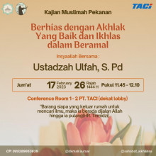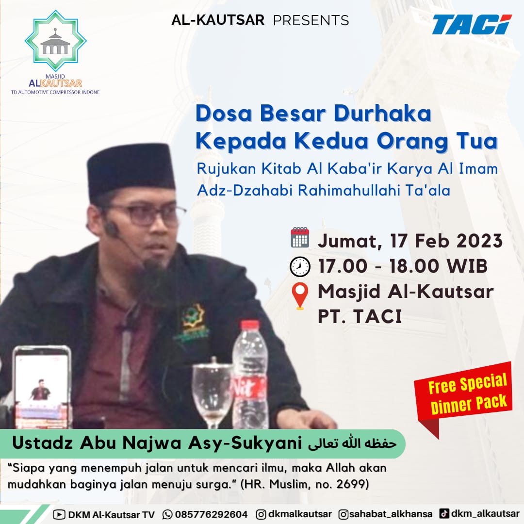 Jangan lupa, setiap Jumat Sore, Masjid Al Kautsar TACI mengadakan kajian offline. Untuk hari ini, Kami mengusung tema "Dosa Besar Durhaka Kepada Kedua Orang Tua" yang akan disampaikan oleh ustad Abu Najwa Asy-Sukyani.
