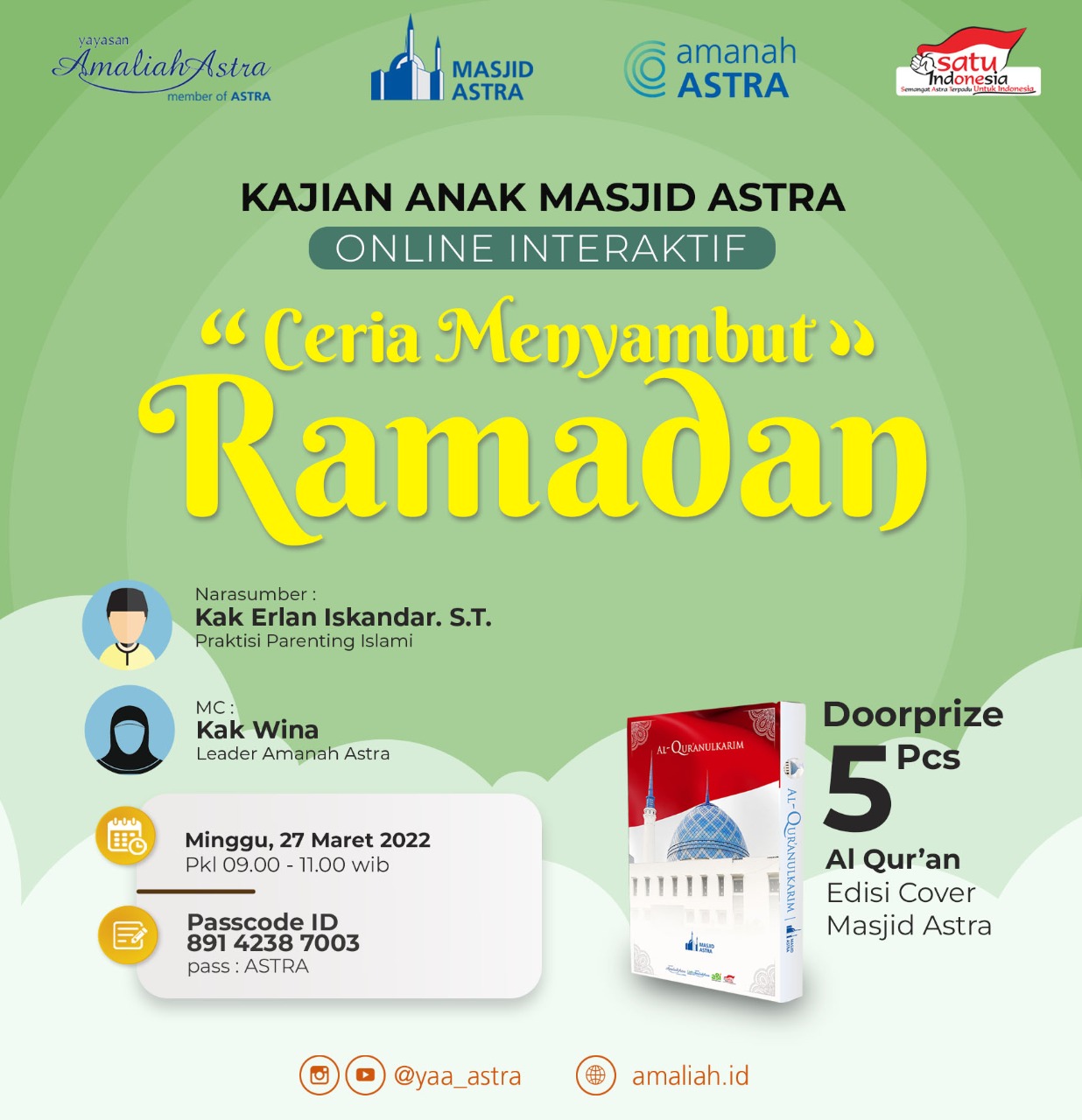 Pukul 09.00 WIBPesantren Virtual Anak - Masjid Astra - Ceria Menyambut Ramadhan di pandu Kak Erlan Iskandar