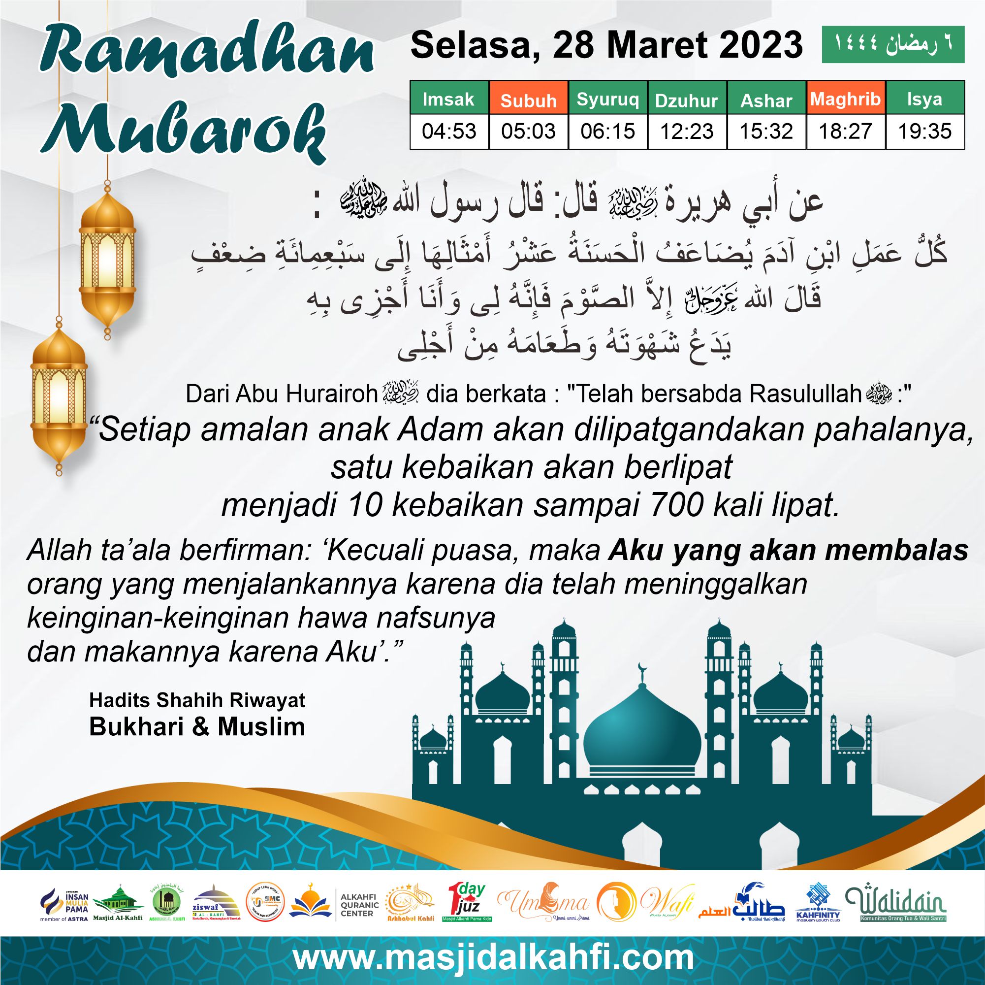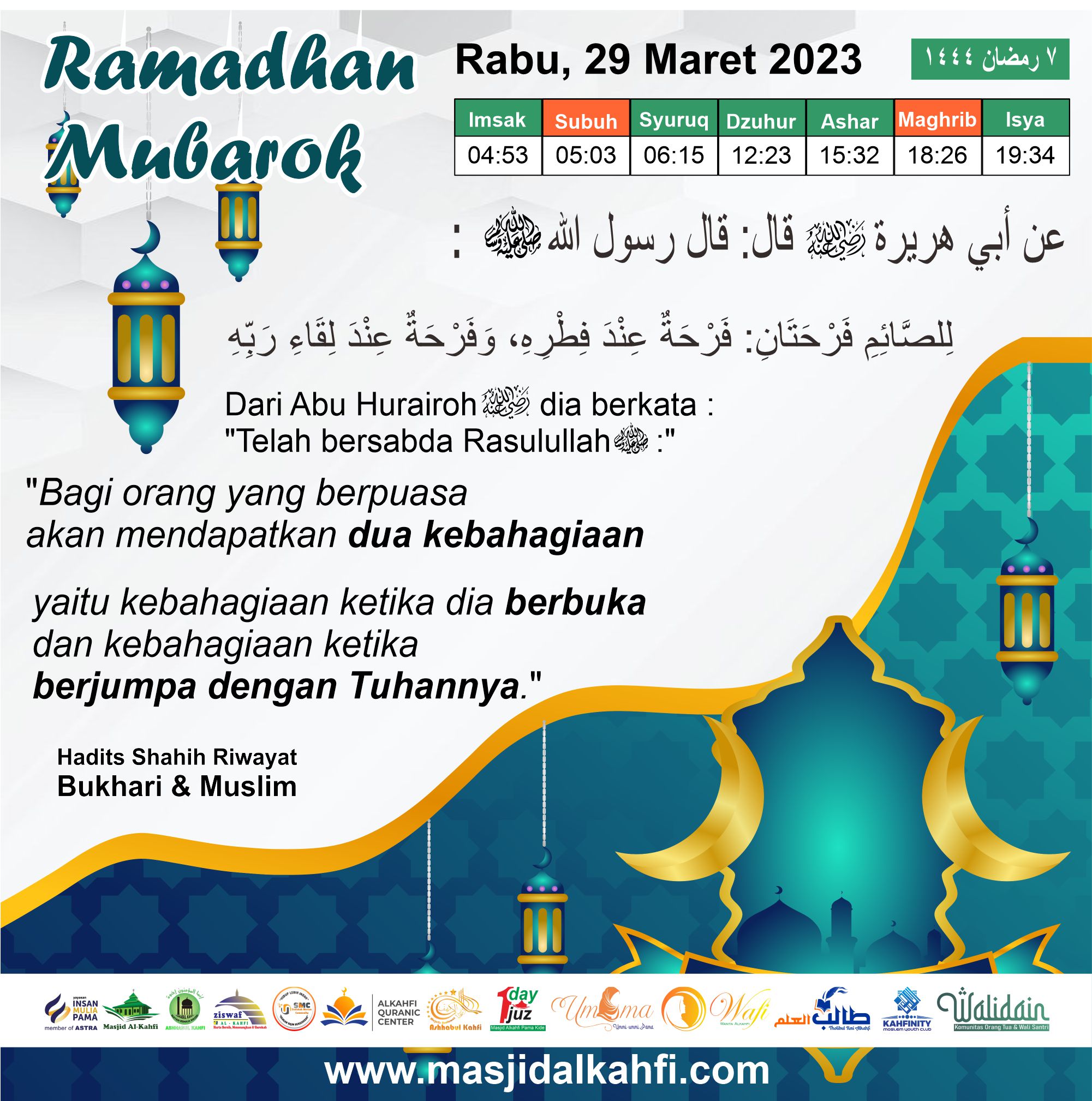 Telah bersabda Rasulullah Shallallahu Alaihi Wassalam :“Bagi orang yang berpuasa akan mendapatkan dua kebahagiaan yaitu kebahagiaan ketika dia berbuka dan kebahagiaan ketika berjumpa dengan Tuhannya.” HR. Bukhori & Muslim