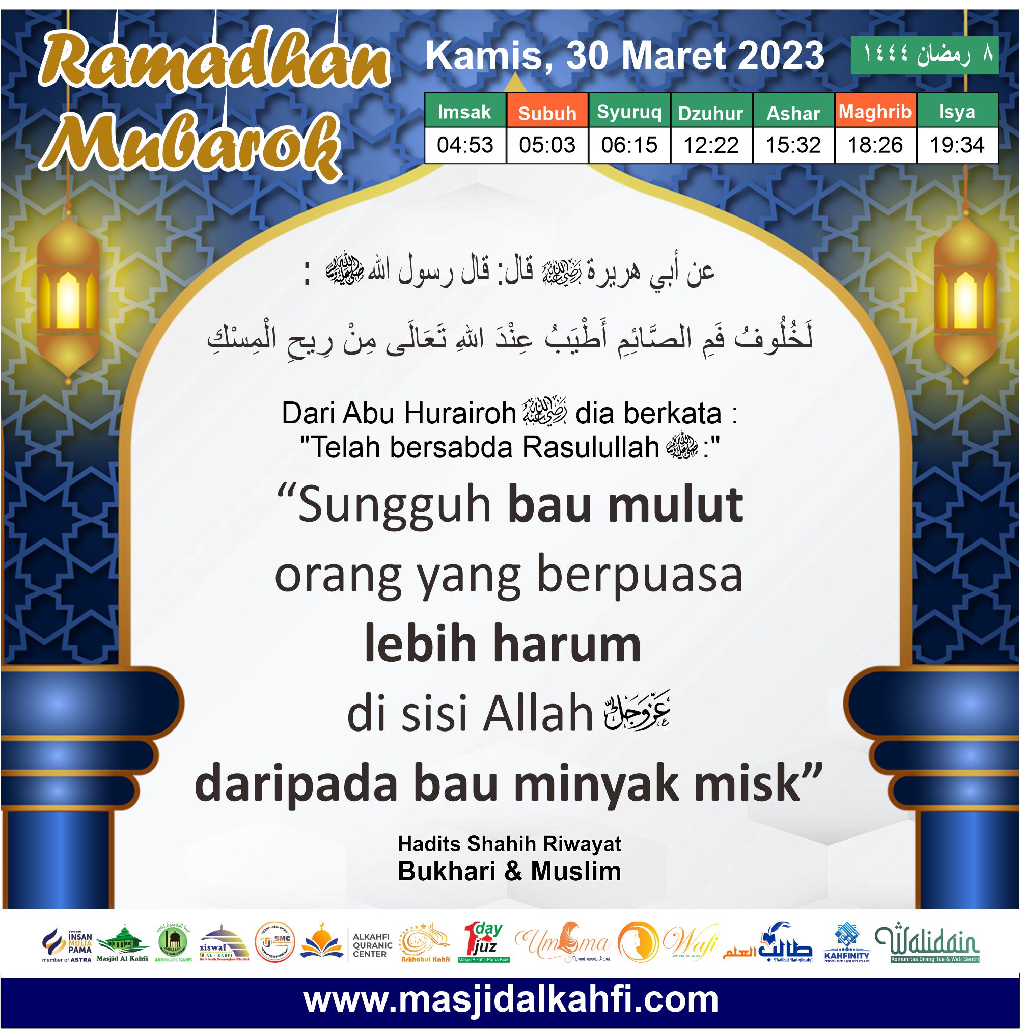 Telah bersabda Rasulullah Shallallahu Alaihi Wassalam :“Sungguh bau mulut orang yang berpuasa lebih harum di sisi Allah Subhana Wataala daripada bau minyak misk.” HR. Bukhori & Muslim