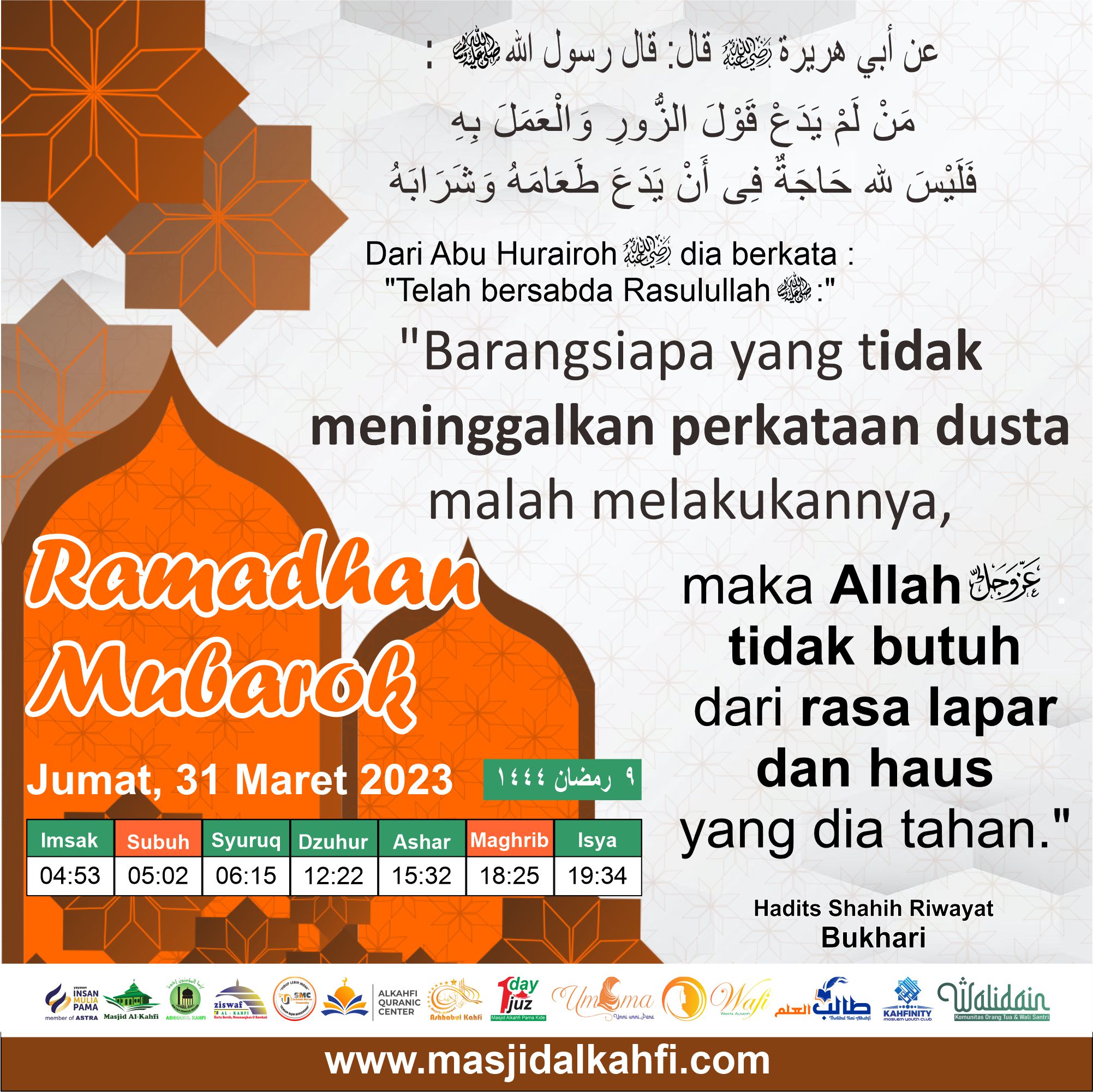 Telah bersabda Rasulullah Shallallahu Alaihi Wassalam :"Barangsiapa yang tidak meninggalkan perkataan dusta malah mengamalkannya, maka Allah Subhana Wata'ala tidak butuh dari rasa lapar dan haus yang dia tahan.” (HR. Bukhari no. 1903).