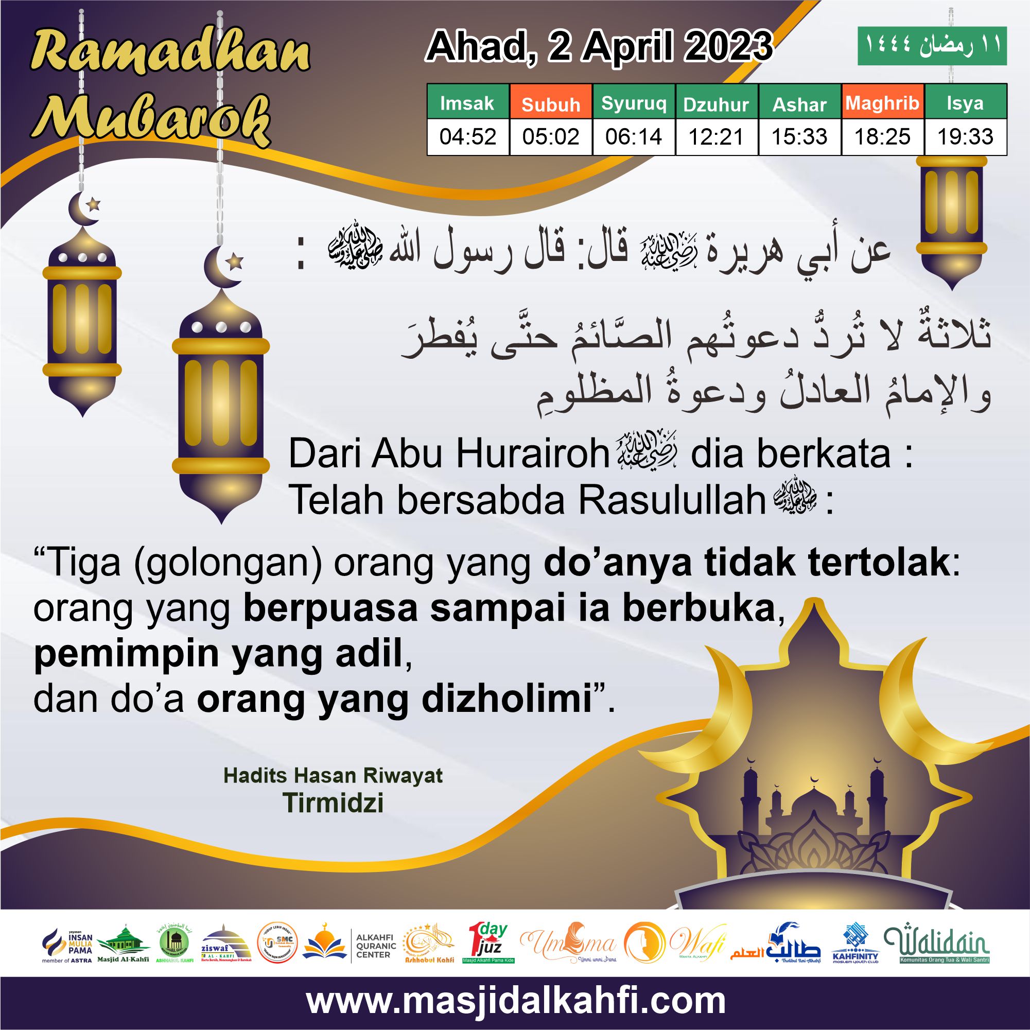 orang yang berpuasa sampai ia berbuka, pemimpin yang adil, dan do’a orang yang dizholimi”. (Hadits Hasan Riwayat Tirmidzi) -