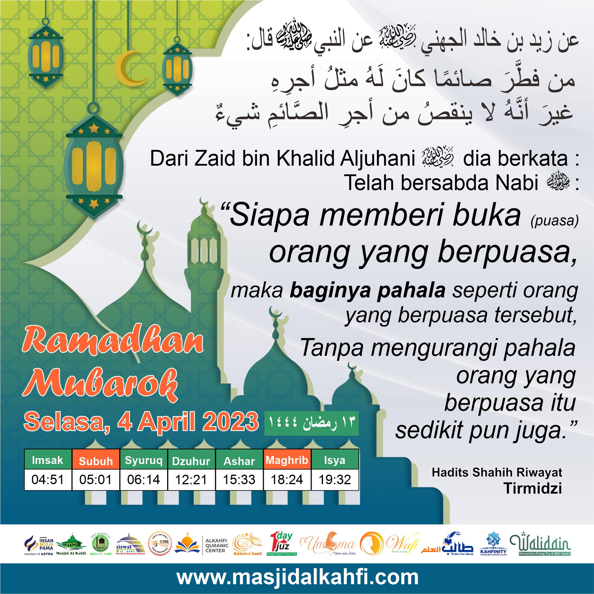 “Barang siapa memberi makan untuk berbuka kepada orang yang berpuasa, maka baginya pahala seperti orang yang berpuasa tersebut, tanpa mengurangi pahala orang yang berpuasa itu sedikit pun juga.” HR. Tirmidzi