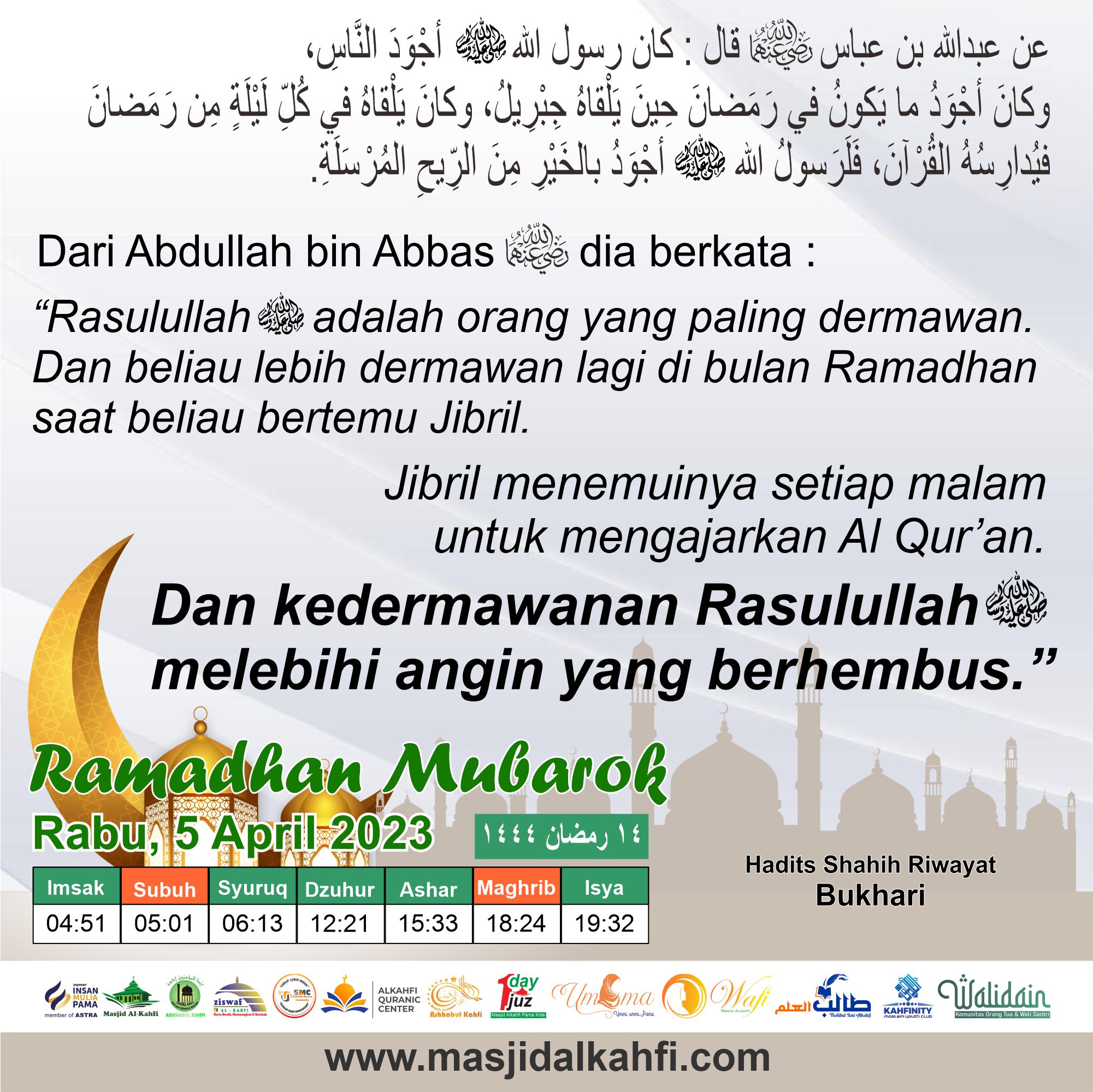 “Rasulullah shallallahu ‘alaihi wa sallam adalah orang yang paling dermawan. Dan beliau lebih dermawan lagi di bulan Ramadhan saat beliau bertemu Jibril. Jibril menemuinya setiap malam untuk mengajarkan Al Qur’an. Dan kedermawanan Rasulullah shallallahu ‘alaihi wa sallam melebihi angin yang berhembus.” (HR. Bukhari)