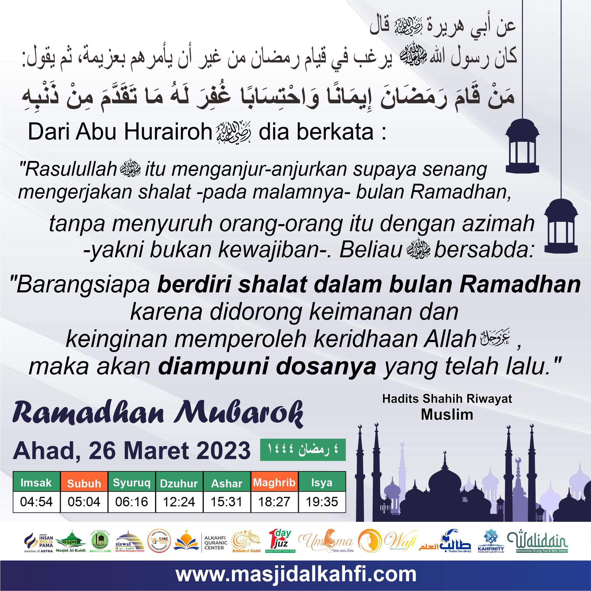 “Telah datang kepada kalian Ramadhan, bulan yang diberkahi. Allah (Azzawajalla) mewajibkan atas kalian berpuasa padanya.