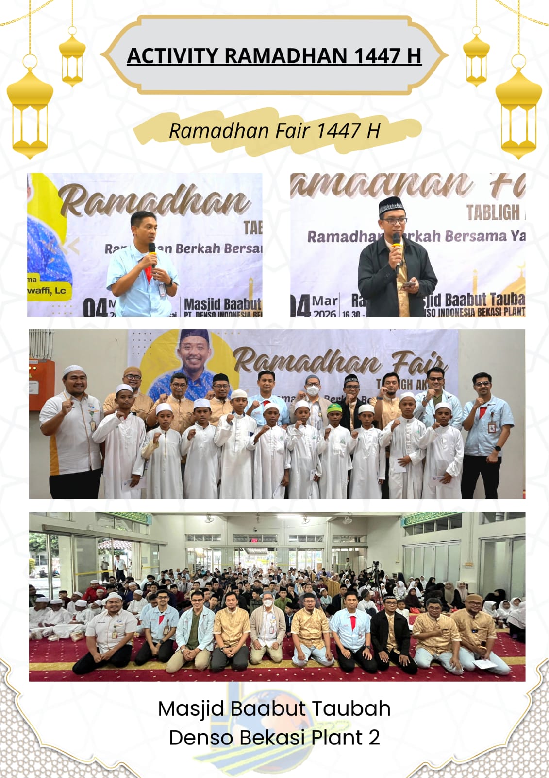 Telah terlaksana dengan baik Ramadhan Fair Masjid Baabut Taubah Denso Bekasi Plant 2.Kegiatan ini diisi dengan berbagai rangkaian acara yang penuh keberkahan, di antaranya: