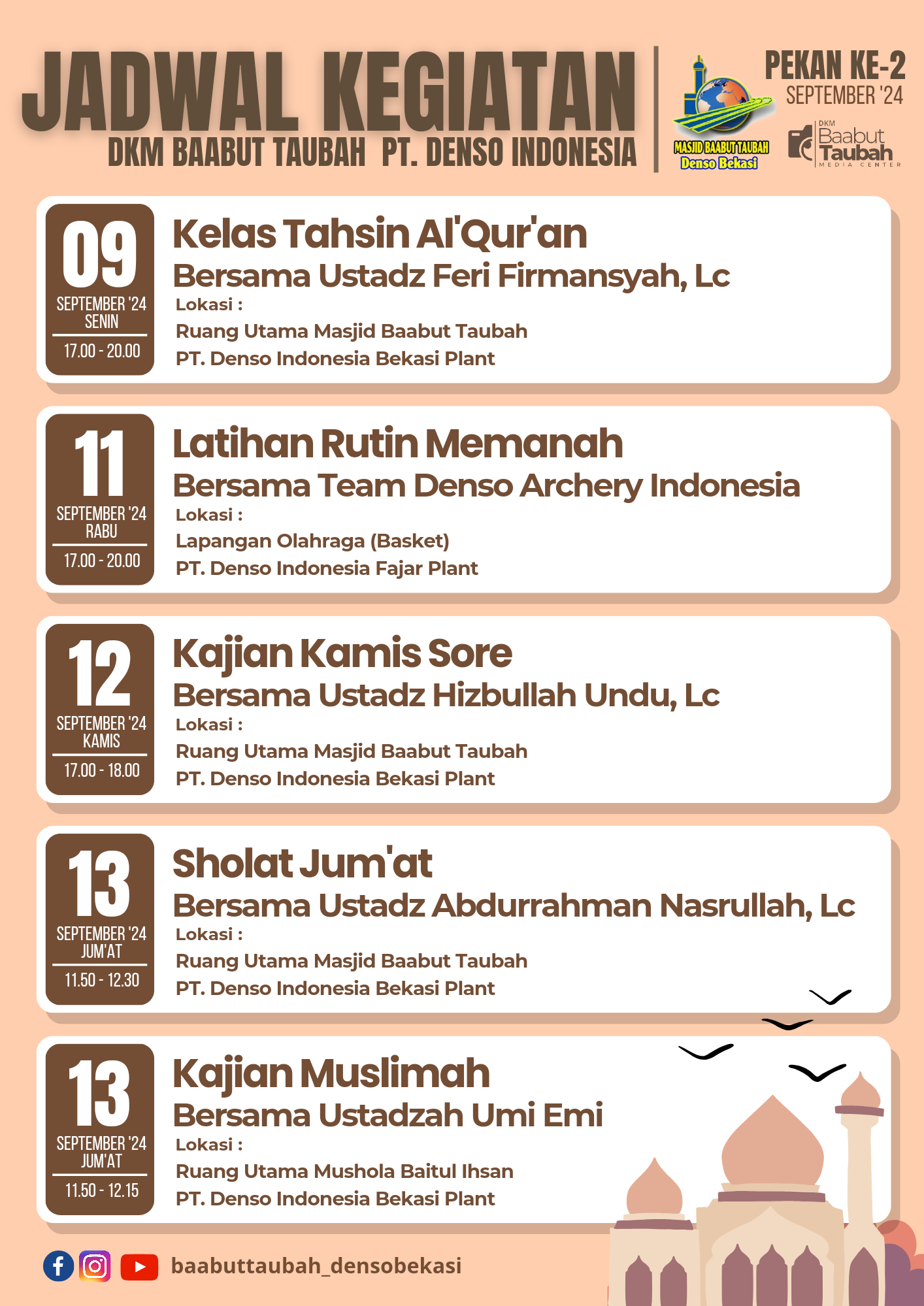Assalamu'alaikum wrwb,,,Izinkan kami menyampaikan kegiatan di minggu kedua bulan September 2024 di Masjid Baabut Taubah