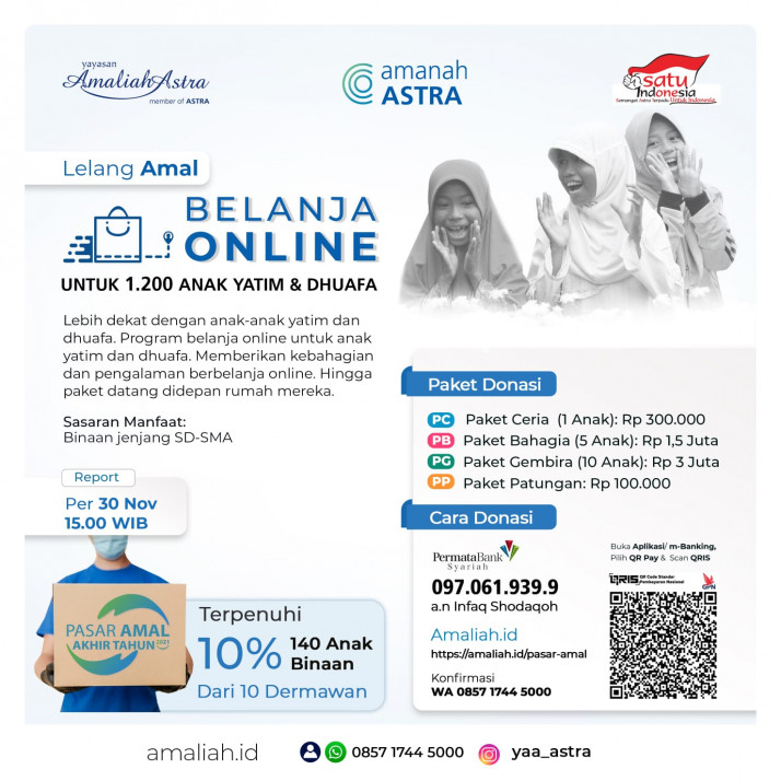 Program Belanja Online untuk 1.200 Anak Yatim & DhuafaBerbagi kebahagiaan bersama anak-anak yatim dan dhuafa. Salah satunya dengan mengajak berbelanja kebutuhan sekolah dan pokok mereka.