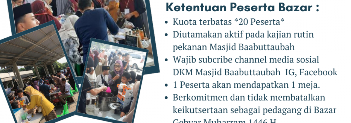 InsyaAllah dalam acara gebyar Muharram nanti yang akan dilaksanakan oada tanggal 20 July 2024, DKM Baabut Taubah kembali membuka pendagtaran untuk UMKM muslim karyawann PT. Denso Indonesia untuk ikut serta dalam kegiatan tersebut.