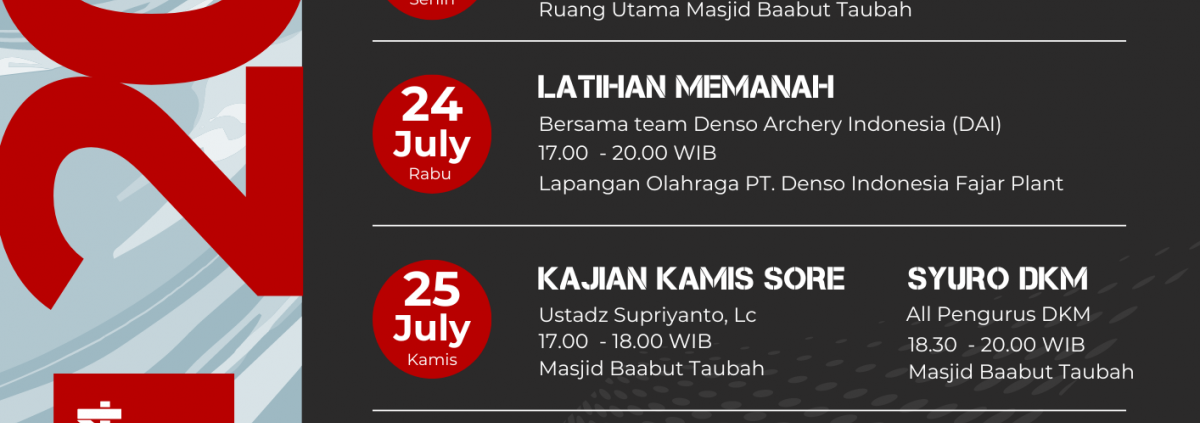Alhamdulillah wa syukurillah,, kegiatan kegiatan DKM Baabut Taubah PT. Denso Indonesia pada bulan Juli 2024 minggu keempat dapat berjalan dengan baik dan lancar,, yang tentunya semua ini atas izin dan pertolongan Allah swt,,