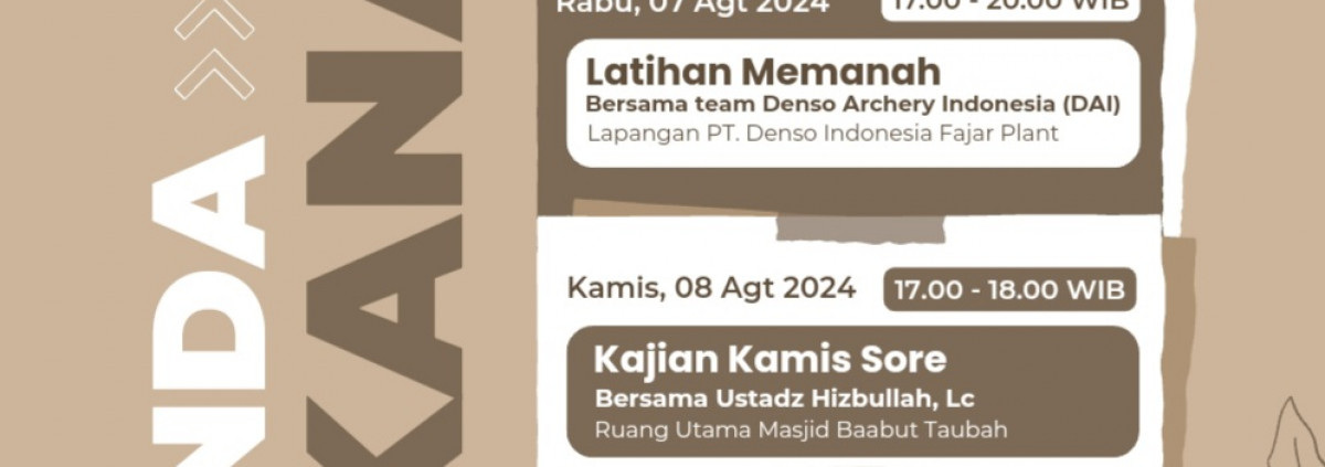 Alhamdulillah wa syukurillah,, kegiatan kegiatan DKM Baabut Taubah PT. Denso Indonesia pada bulan JlAgustus 2024 minggu pertama dapat berjalan dengan baik dan lancar,, yang tentunya semua ini atas izin dan pertolongan Allah swt,,