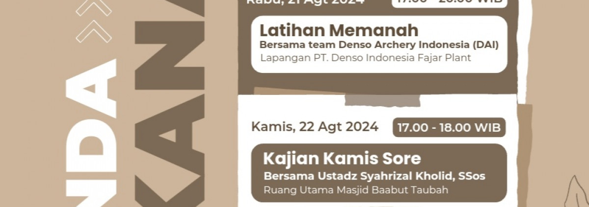 Alhamdulillah wa syukurillah,, kegiatan kegiatan DKM Baabut Taubah PT. Denso Indonesia pada bulan Agustus 2024 minggu kelima dapat berjalan dengan baik dan lancar,, yang tentunya semua ini atas izin dan pertolongan Allah swt,,