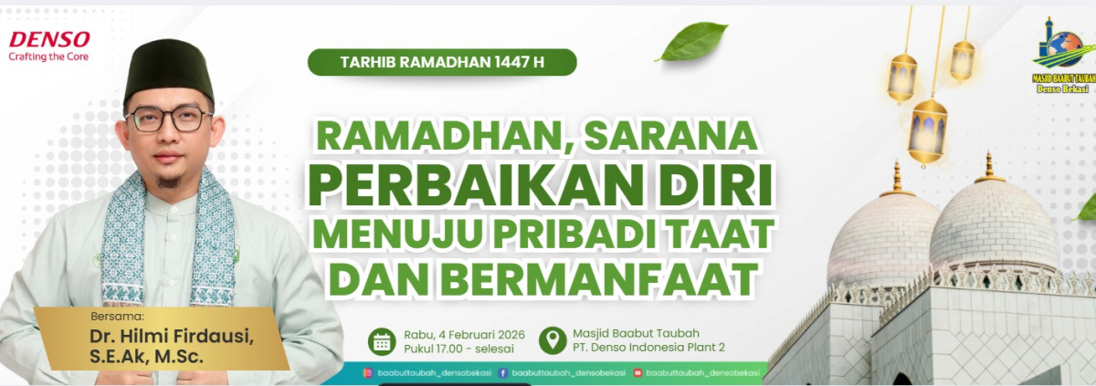 Masjid Baabut Taubah PT. Denso Indonesia kembali mengadakan kegiatan Tarhib Ramadhan 1447H dengan tema "Ramadhan Sarana Perbaikan Diri, menuju pribadi taat dan bermanfaat". Acara ini diisi oleh Ustadz Hilmi Firdausi dan dihadiri oleh pihak manajemen, serikat pekerja, serta karyawan dan karyawati PT. Denso Indonesia.