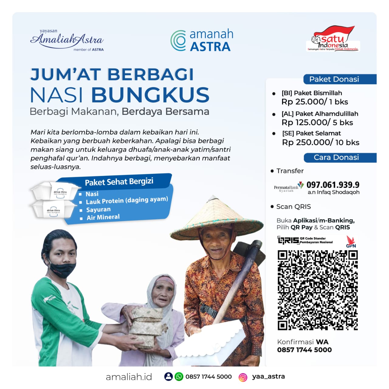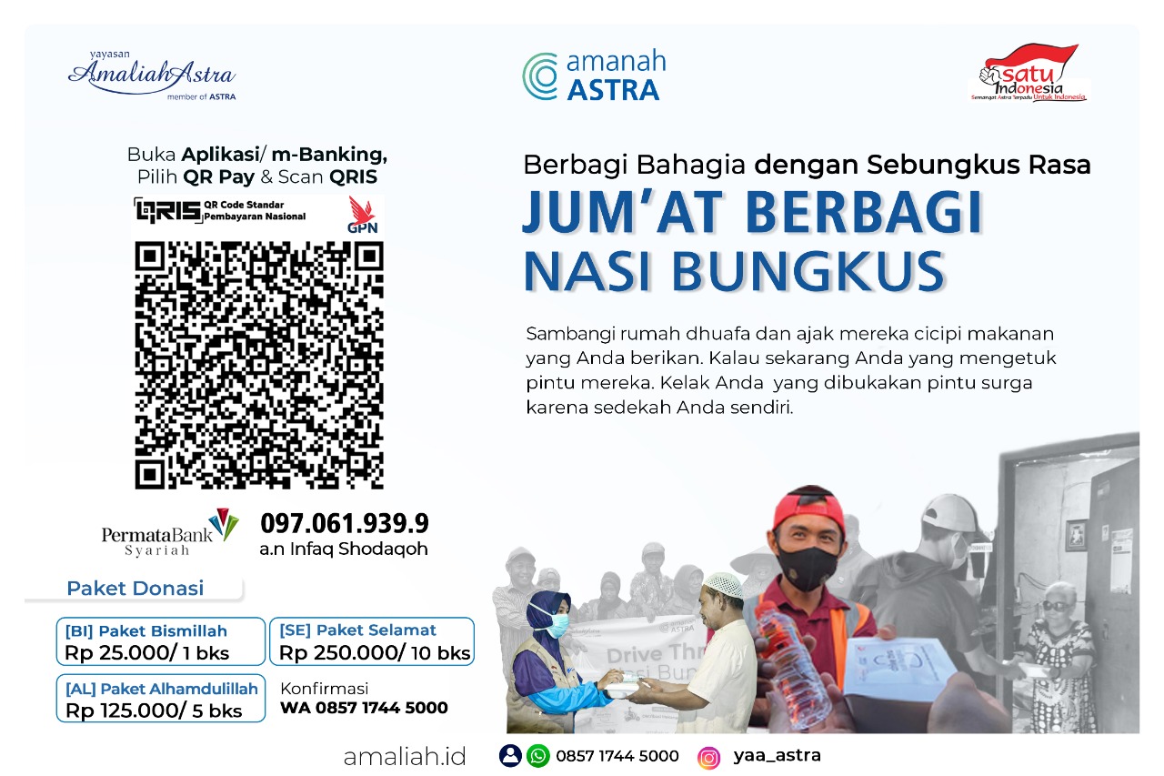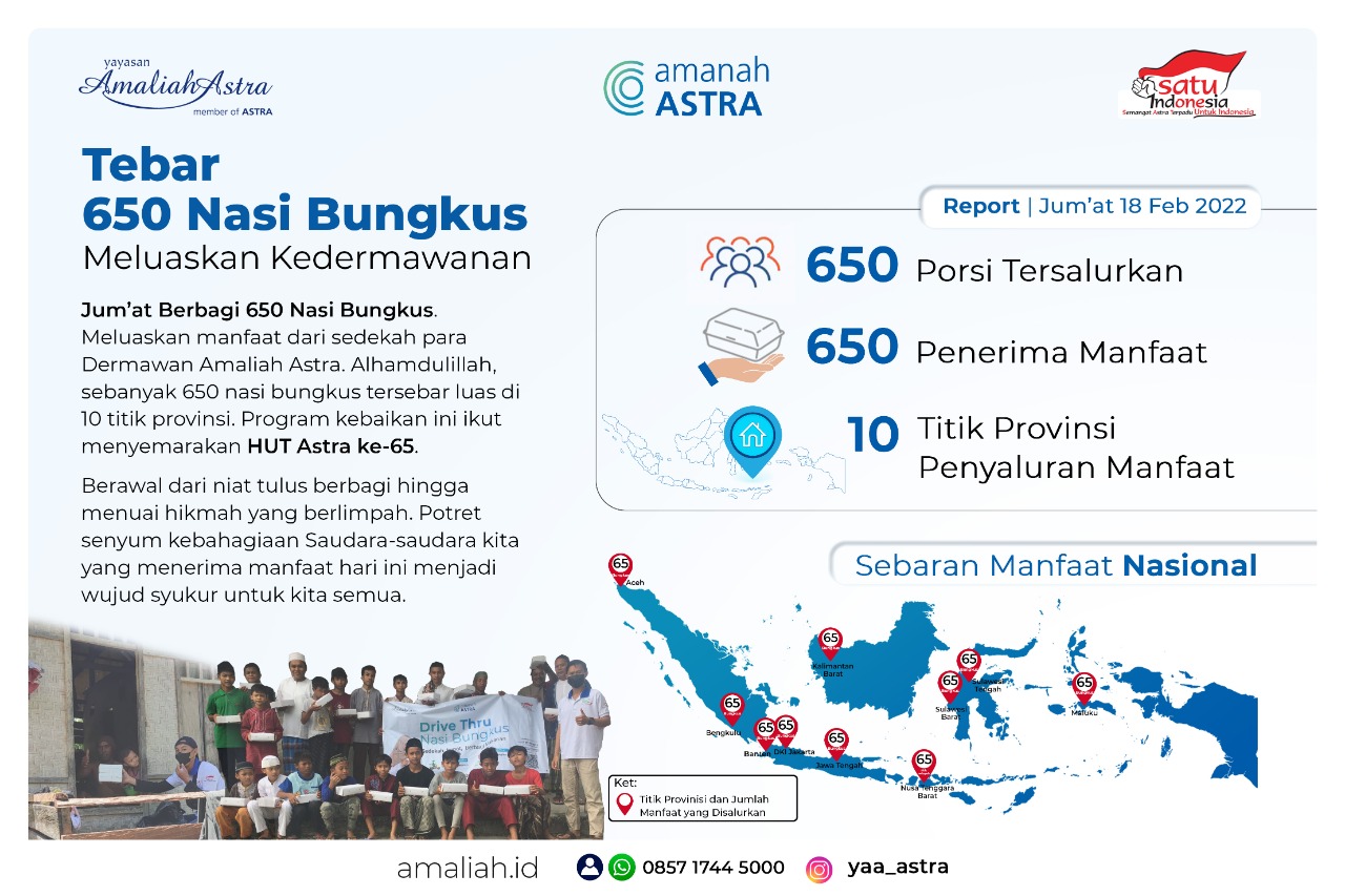 Jum'at berbagi 650 Nasi Bungkus. Meluaskan manfaat dari sedekah para Dermawan Amaliah Astra. Alhamdulillah, sebanyak 650 nasi bungkus tersebar luas di 10 titik wilayah nasional. Program kebaikan ini ikut menyemarakan HUT ASTRA ke-65.