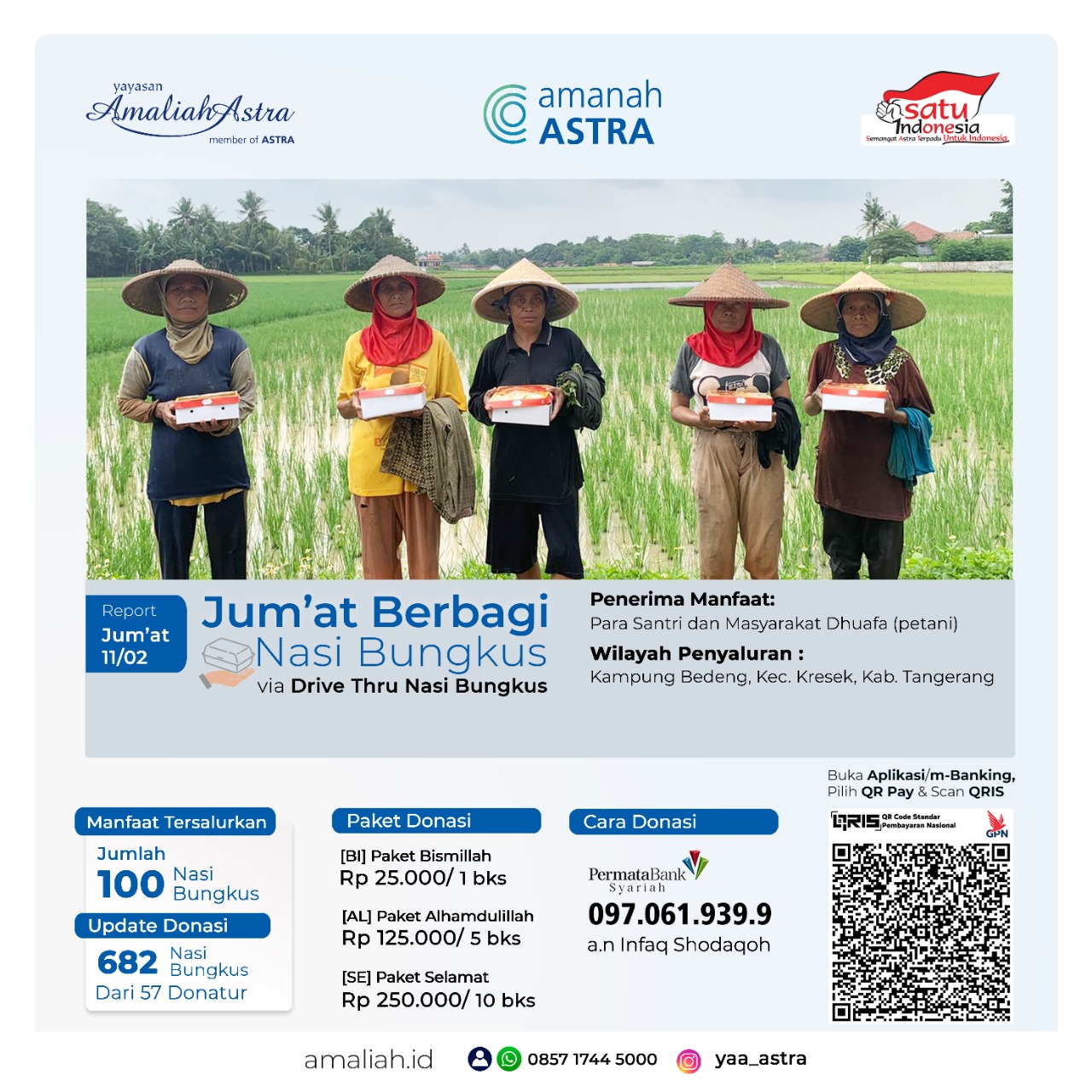 Jum'at Berbagi Nasi BungkusAlhamdulillah, amal rutin para dermawan berbuah kebermanfaatan. Menghadirkan kebahagiaan 100 nasi bungkus di tengah makan siang para petani dan santri (wilayah Tangerang).