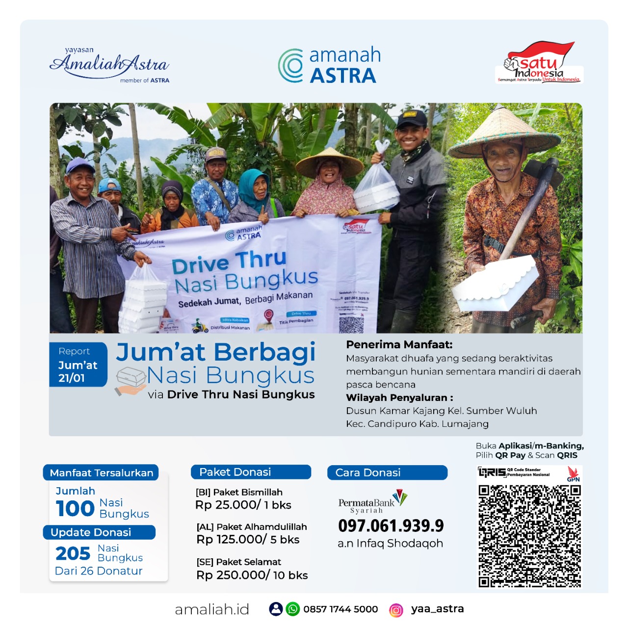 Jum'at Berbagi Nasi BungkusMeluaskan manfaat dari kebaikan para Dermawan di hari Jum'at ini. Alhamdulillah sebanyak 100 nasi bungkus telah dibagikan kepada masyarakat dhuafa di Kab. Lumajang, Jawa Timur. "Maturnuwun mpun diparingi sarapan sego" (Terimakasih sudah diberi sarapan nasi), ucap penerima manfaat.