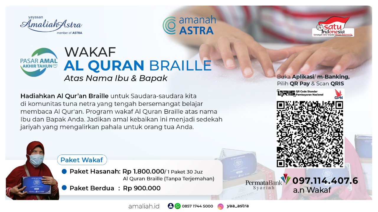 Berwakaf Al Qur’an Braille yang dibutuhkan mereka untuk belajar dan membaca qur'an. Jadikan amal baik ini sebagai hadiah untuk Ibu dan Bapak Anda. Insya Allah setiap huruf yang dibaca mengalirkan pahala untuk Anda dan orangtua.