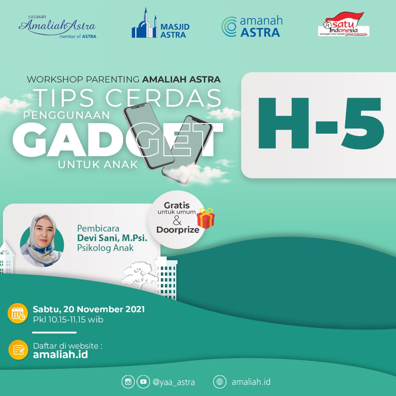 Yuk ikuti Workshop Parenting dengan judul Tips Cerdas Penggunaan Gadget Untuk Anak, yang akan dilaksanakan pada:Hari dan tanggal : Sabtu, 20 November 2021