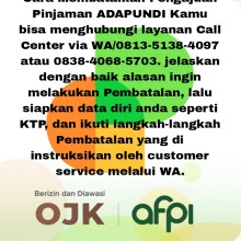1 hari yang lalu PublikCara Membatalkan Pinjaman ADAPUNDI Kamu bisa menghubungi layanan pelanggan resmi Via WA/ (081351384097 atau 083840685703). ikuti Arahan hingga proses pembatalan selesai Customer Service Layanan real-time 24/7. Senin - Minggu,