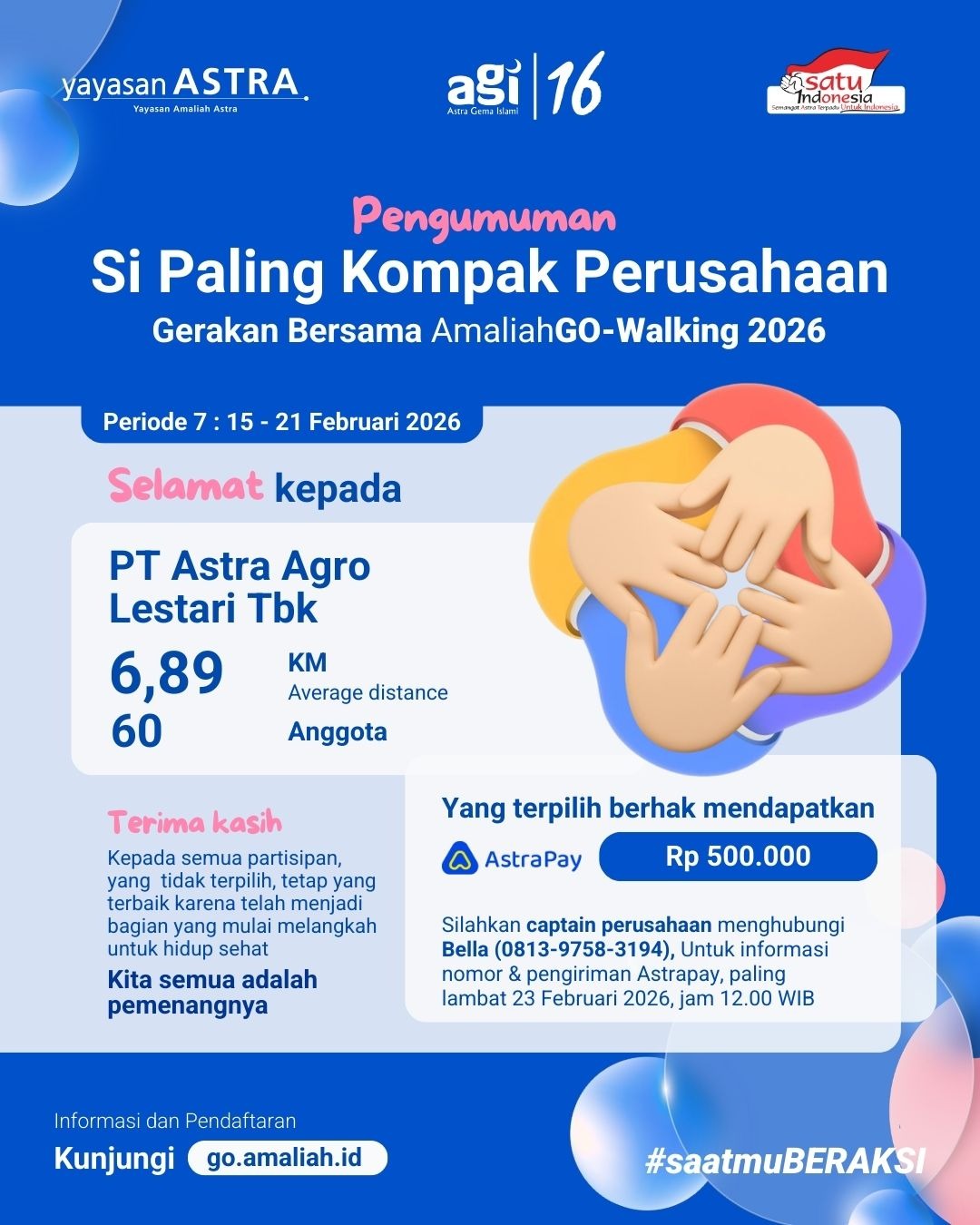 Berkat kekompakan, partisipasi aktif, dan semangat hidup sehat seluruh tim, *PT Astra Agro Lestari* berhasil meraih predikat Pemenang Kategori *Si Paling Kompak Perusahaan* pada program Gerakan Bersama AmaliahGO-Walking 2026 (Periode 7).