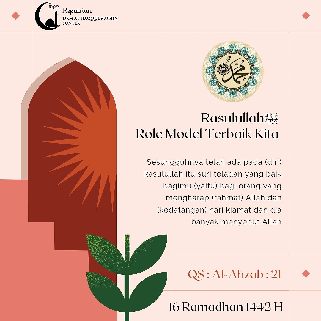 Sesungguhnya telah ada pada (diri) Rasulullah itu suri teladan yang baik bagimu (yaitu) bagi orang yang mengharap (rahmat) Allah dan (kedatangan) hari kiamat dan dia banyak menyebut Allah.