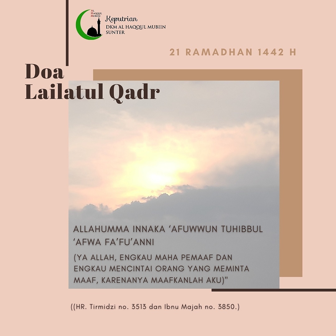 Dari ‘Aisyah –radhiyallahu ‘anha-, ia berkata, “Aku pernah bertanya pada Rasulullah shallallahu ‘alaihi wa sallam, yaitu jika saja ada suatu hari yang aku tahu bahwa malam tersebut adalah lailatul qadar, lantas apa do’a yang mesti kuucapkan?” Jawab Rasul shallallahu ‘alaihi wa sallam, “Berdo’alah: