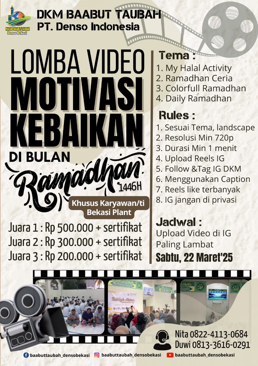 Halo karyawan/ti Bekasi Plant! Yuk, bagikan momen penuh inspirasi di bulan suci ramadhan dengan mengikuti Lomba Video Motivasi Kebaikan yang diadakan oleh DKM Baabut Taubah PT. Denso Indonesia!