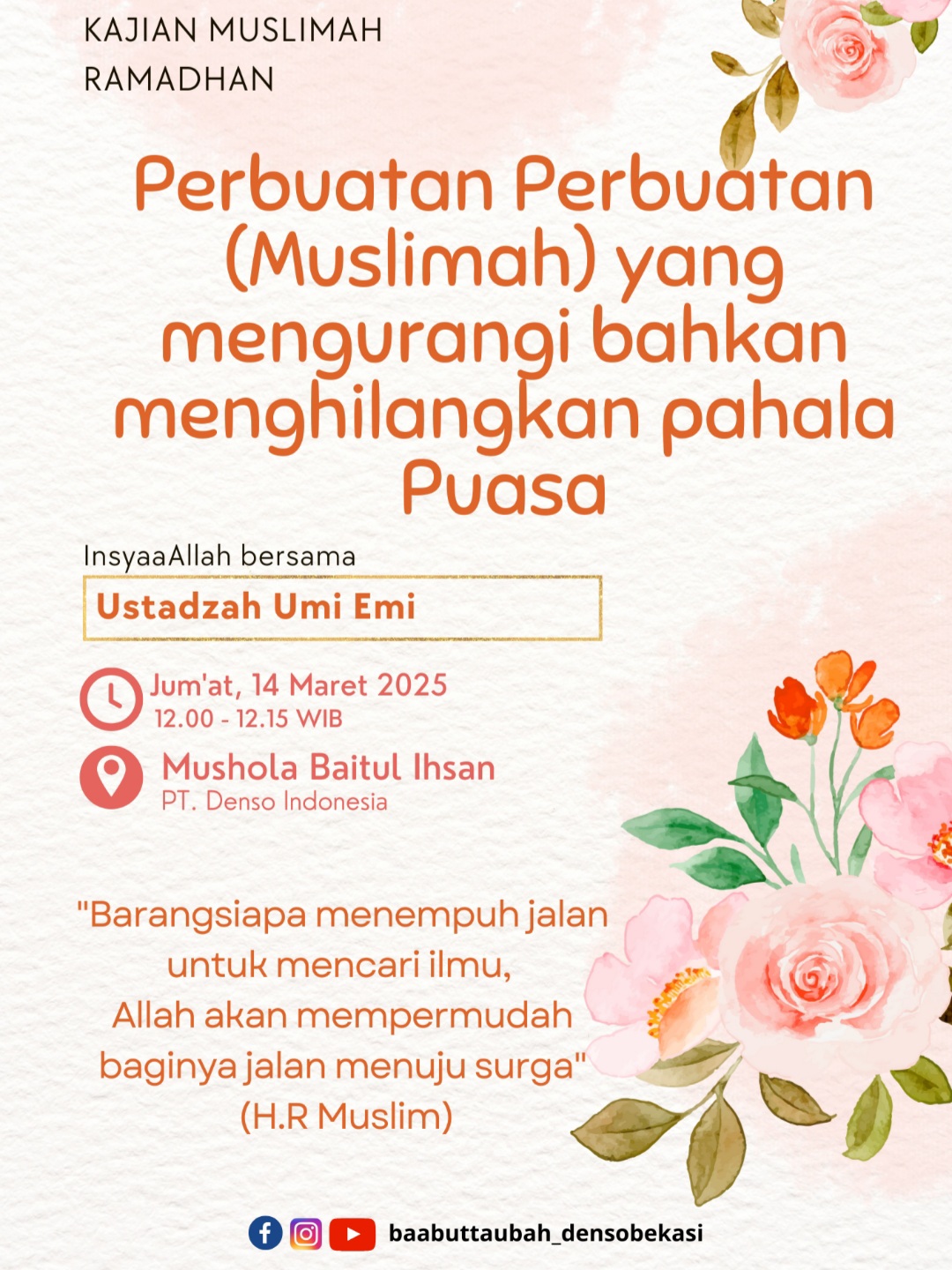 Jangan sampai terlewat ya Kajian Muslimah Ramadhan hari ini ya ๐,Insyaa Allah :