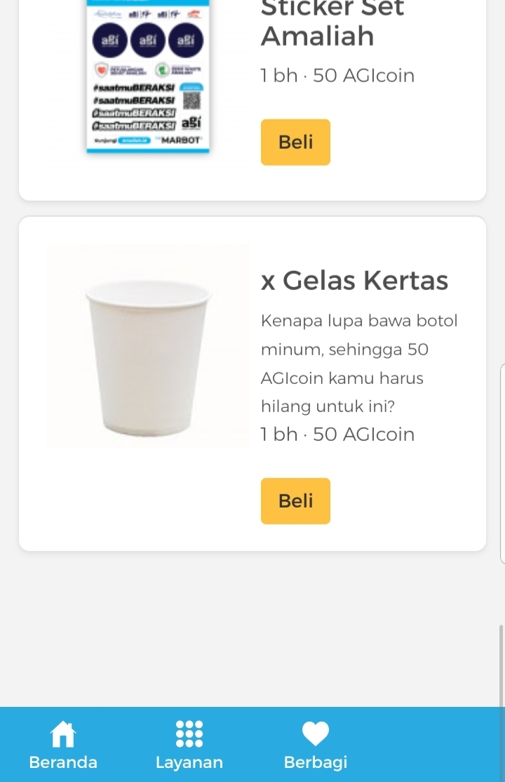 2 years ago Publicjika besok pagi kamu lupa bawa botol minum kamu, silakan beli gelas kertas di booth suvenir, 50 AGIcoin.
