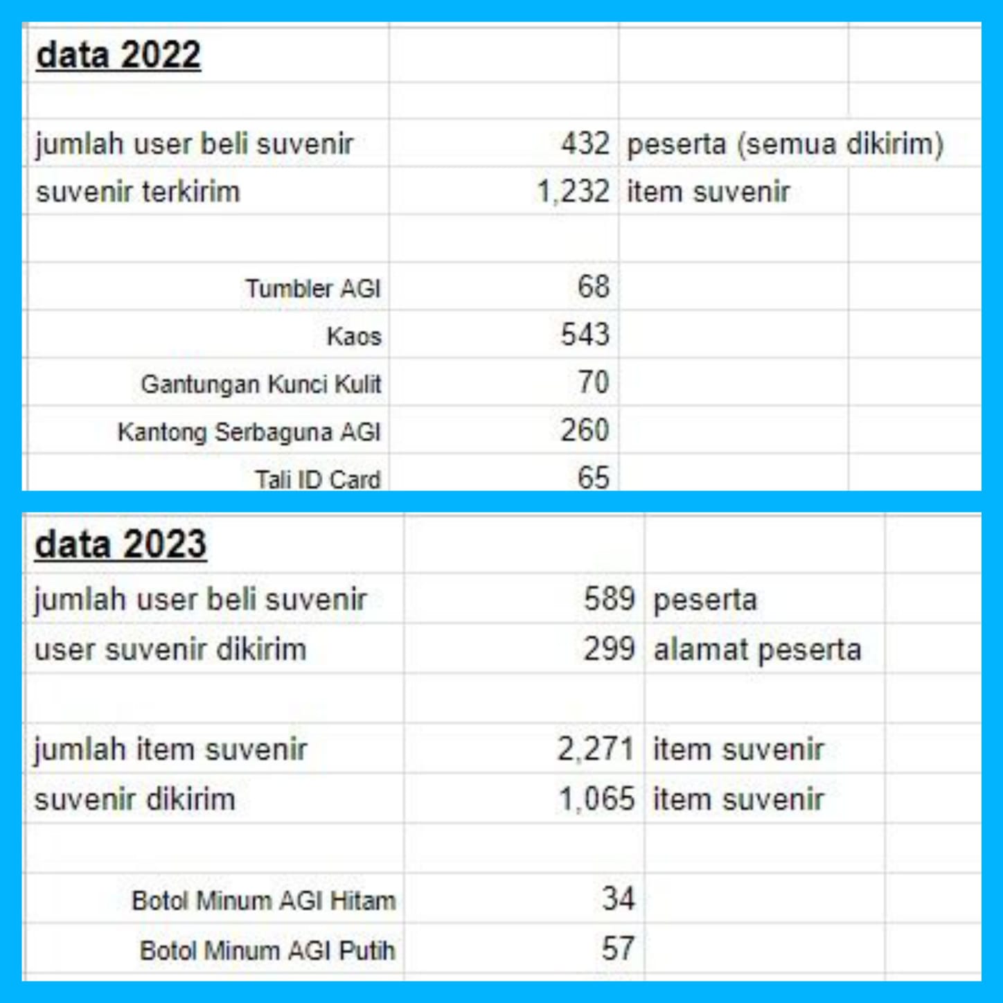 - jumlah tumbler terjual lebih banyak...selanjutnya detail data masih diolah untuk proses pengiriman suvenir selanjutnya...