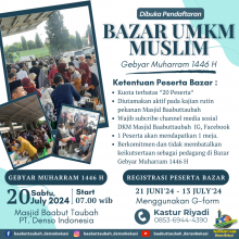 InsyaAllah dalam acara gebyar Muharram nanti yang akan dilaksanakan oada tanggal 20 July 2024, DKM Baabut Taubah kembali membuka pendagtaran untuk UMKM muslim karyawann PT. Denso Indonesia untuk ikut serta dalam kegiatan tersebut.