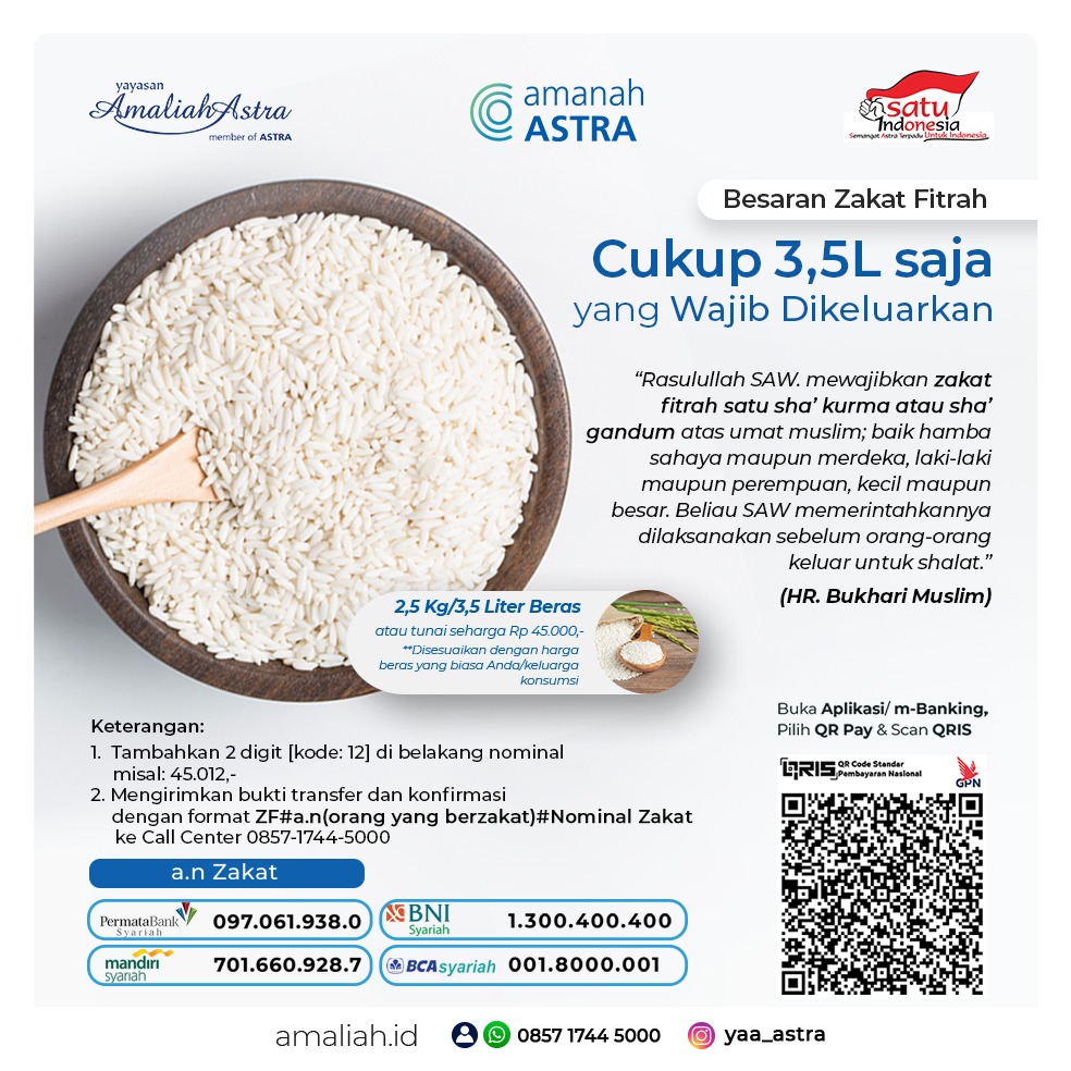 Zakat fitrah yang wajib dikeluarkan sebesar 2,5 kg/3,5 Liter atau seharga beras yang biasa Anda konsumsi (Rp 45.000,-).
