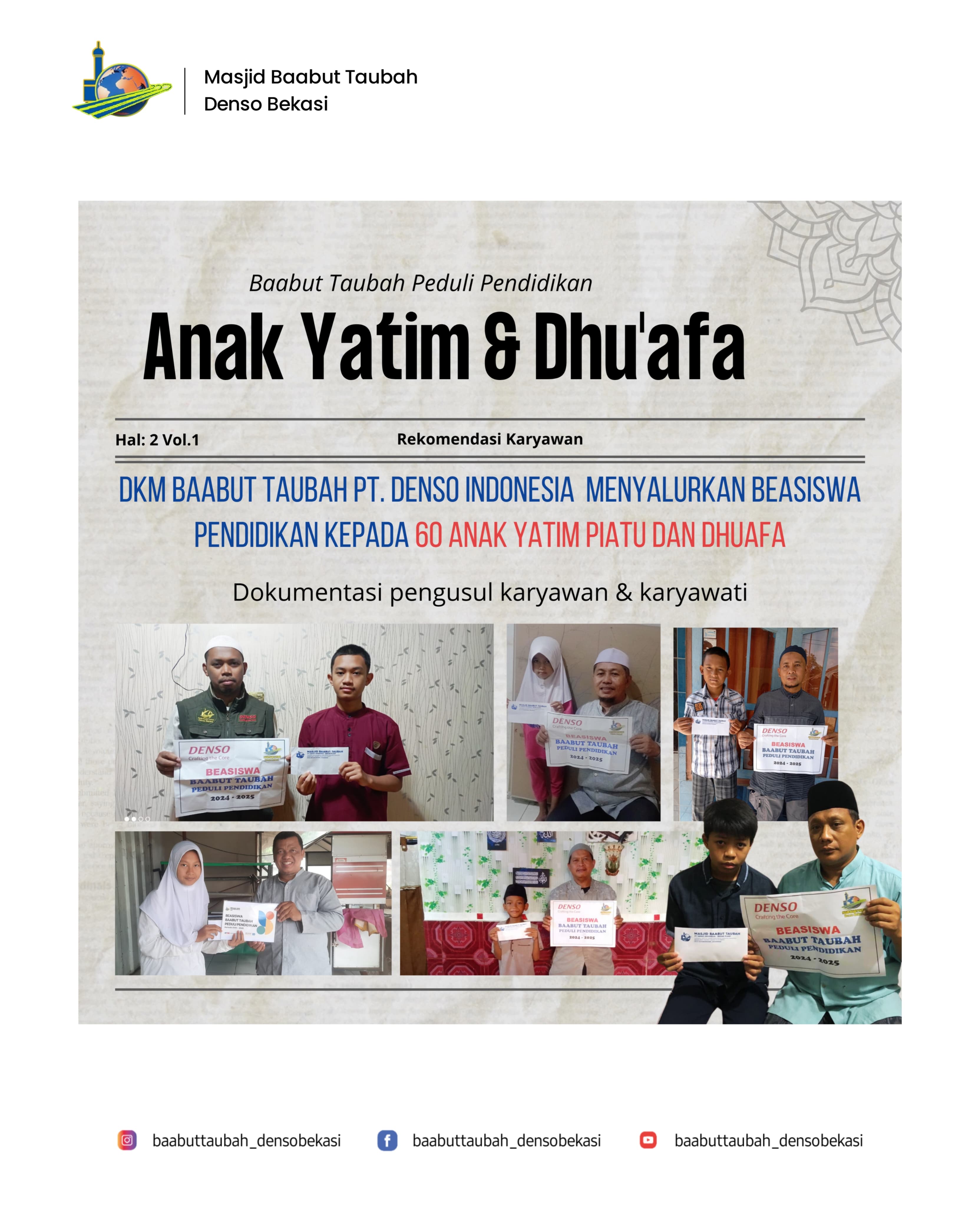Bekasi -- DKM Baabut Taubah PT.Denso Indonesia menyalurkan beasiswa pendidikan kepada 60 anak yatim piatu dan dhuafa selama bulan September 2024 ini. Beasiswa tersebut diberikan untuk membantu meringankan biaya pendidikan anak-anak yatim dan dhuafa agar dapat terus mengenyam pendidikan.