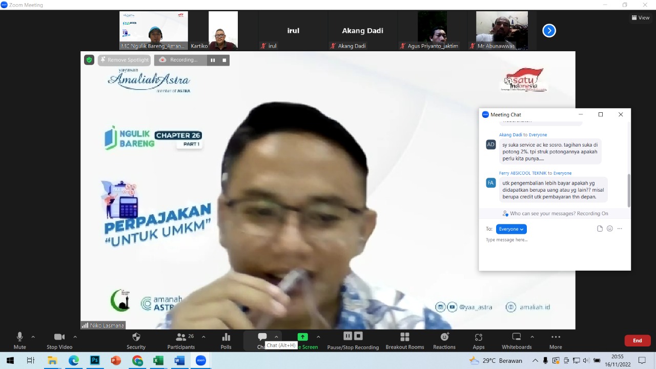 *_Tax and Commercial Associate Manager_ *Jebsen and Jessen Indonesia Group**Telah berlangsung (LIVE) 16/11/2022* dihadiri sebanyak 30 orang Teknisi AC Binaan Amanah Astra dari berbagai wilayah Indonesia, secara online melalui platform zoom meeting.