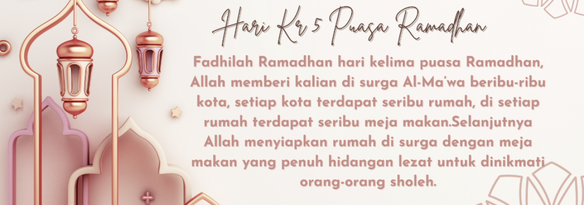 Fadhilah Ramadhan hari kelima puasa Ramadhan, Allah memberi kalian di surga Al-Ma’wa beribu-ribu kota, setiap kota terdapat seribu rumah, di setiap rumah terdapat seribu meja makan.Selanjutnya Allah menyiapkan rumah di surga dengan meja makan yang penuh hidangan lezat untuk dinikmati orang-orang sholeh.