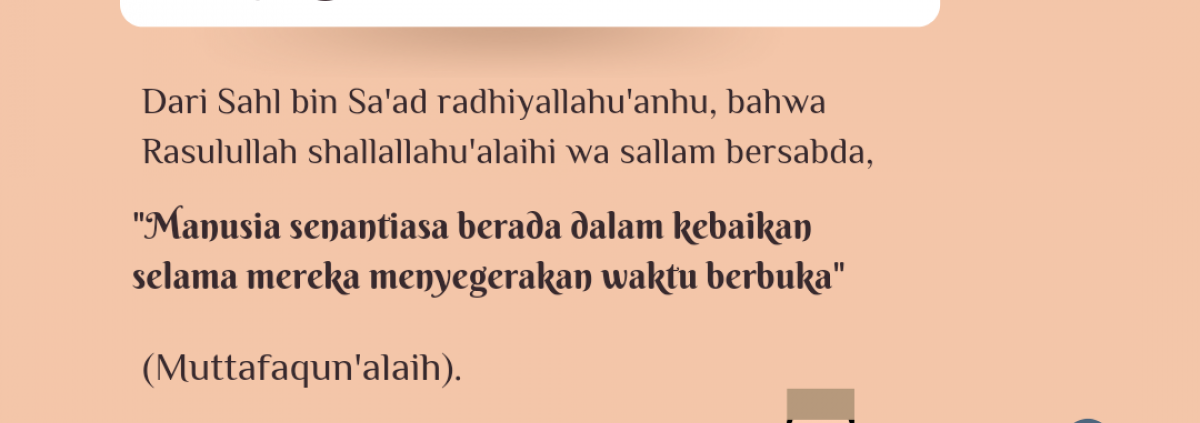 Dari Sahl bin Sa’ad radhiyallahu ‘anhu, bahwa Rasulullah shallallahu ‘alaihi wa sallam bersabda, “Manusia senantiasa berada dalam kebaikan selama mereka menyegerakan waktu berbuka.” (Muttafaqun ‘alaih).