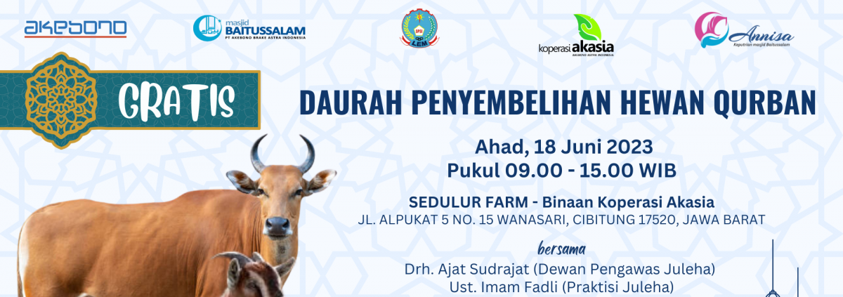 Untuk memberikan pengalaman baru di bulan Dzulhijah ini, Panitia Gema Qurban 1444 H menyelenggarakan Daurah Penyembelihan Hewan Qurban yang akan dilaksanakan pada Ahad, 18 Juni 2023 di Sedulur Farm, Binaan Koperasi Astra di Cibitung, Jawa Barat pada pukul 09.00 - 15.00 WIB.